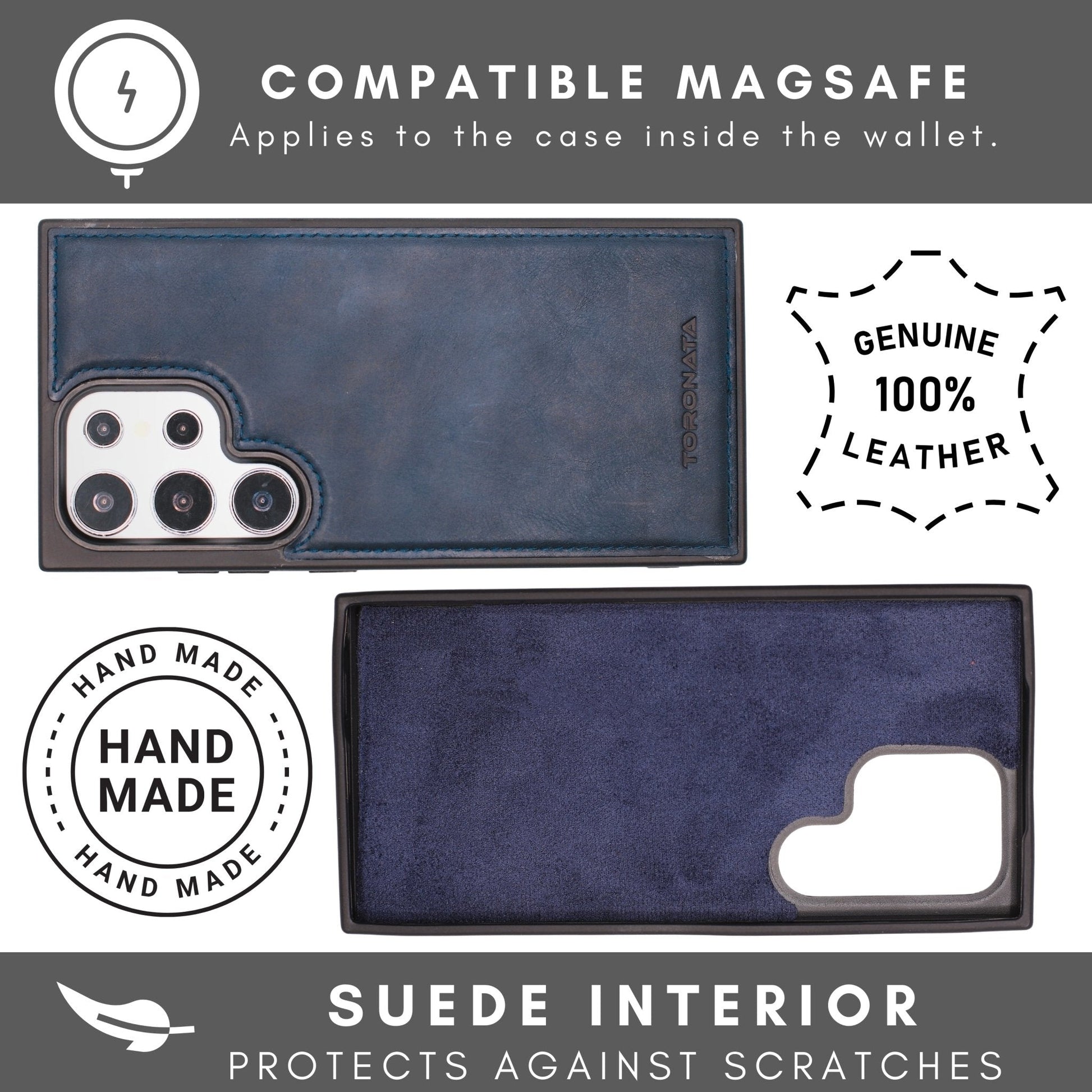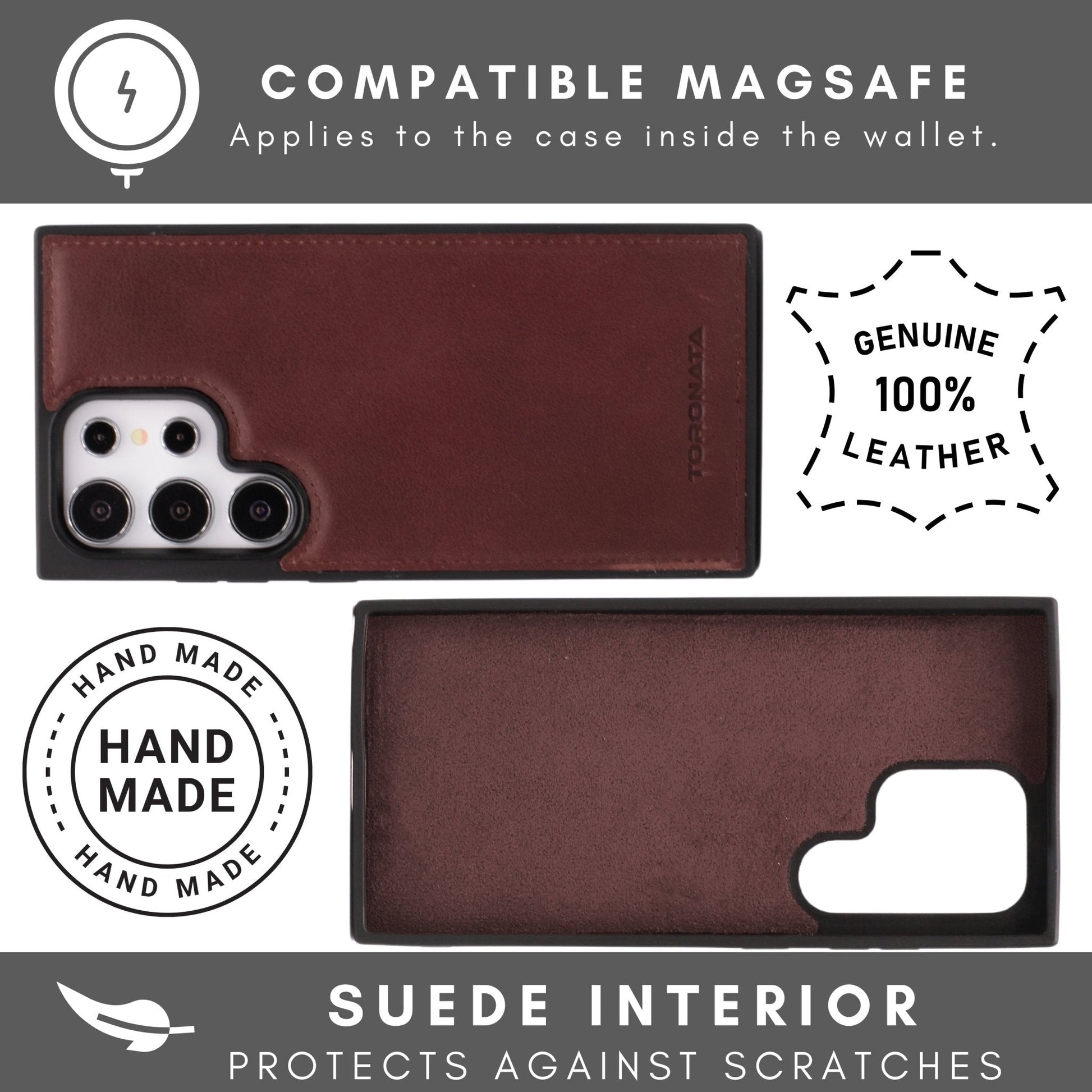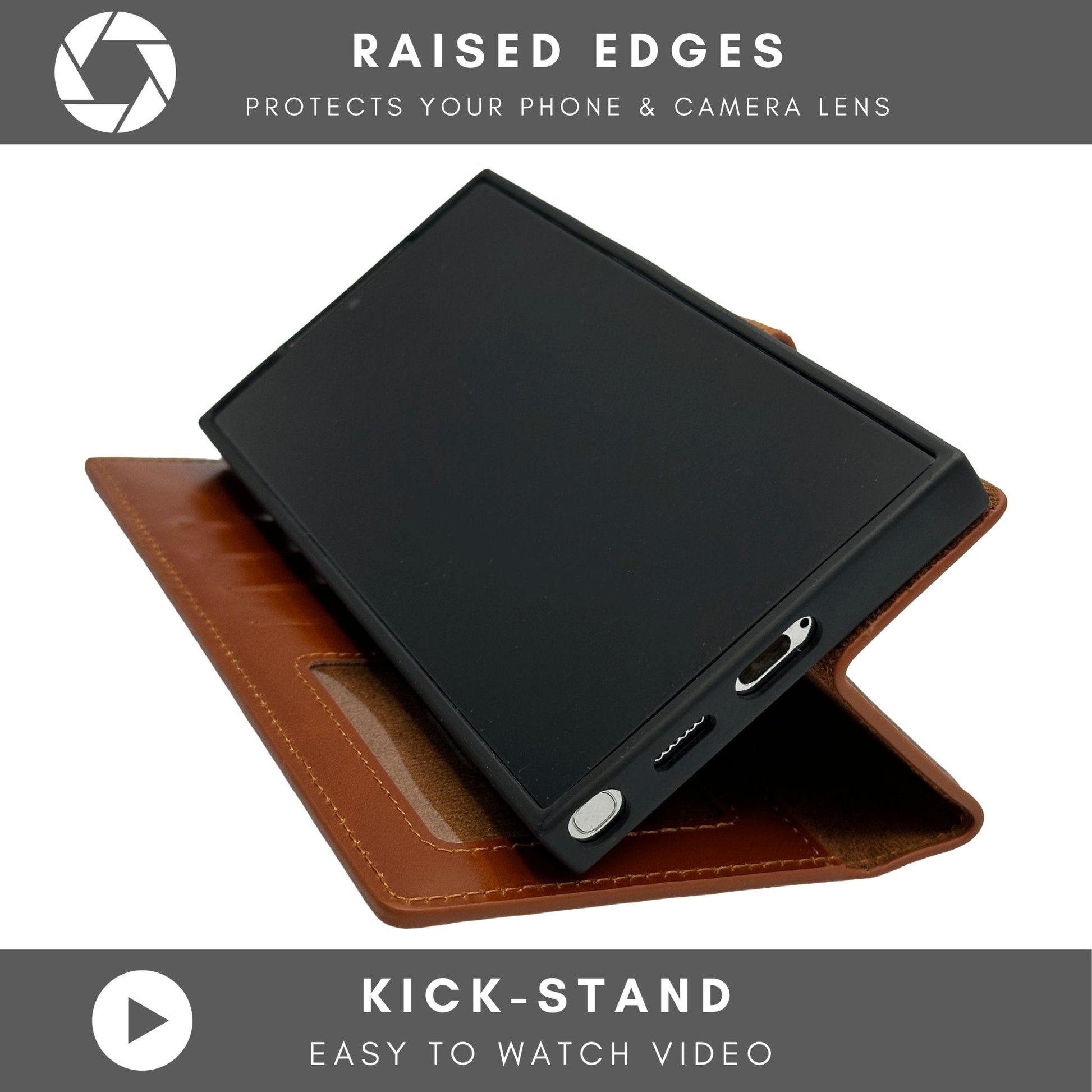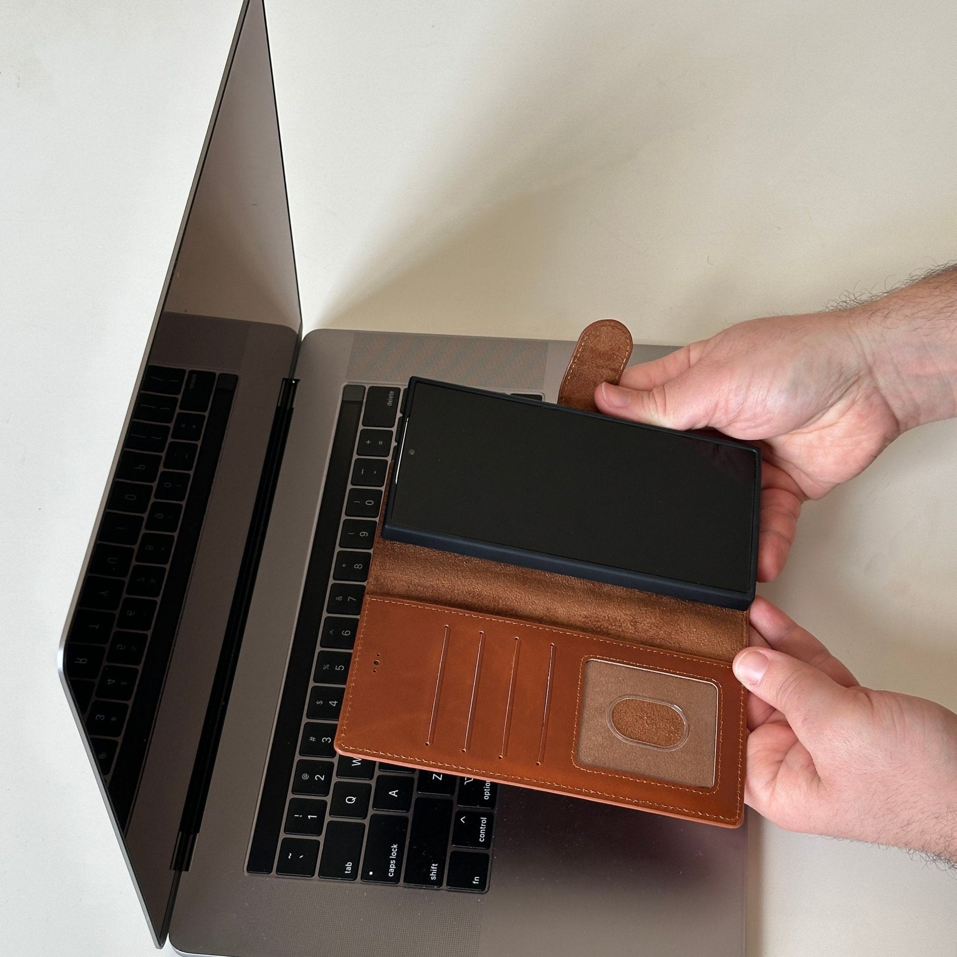 The TORONATA Nevada S24 Ultra leather wallet case was designed with the perfect balance between durability and elegance in mind, allowing you to enjoy the full features of your new smartphone without risking unwanted damage. Made with genuine cowhide leather, available in chic colors, with an anti-scratch anti-drop design that protects the device, plus 4 functional card slots and RFID technology, this S24 phone case converts into a kickstand, making it ideal for hands-free video calls, movies, and videos!