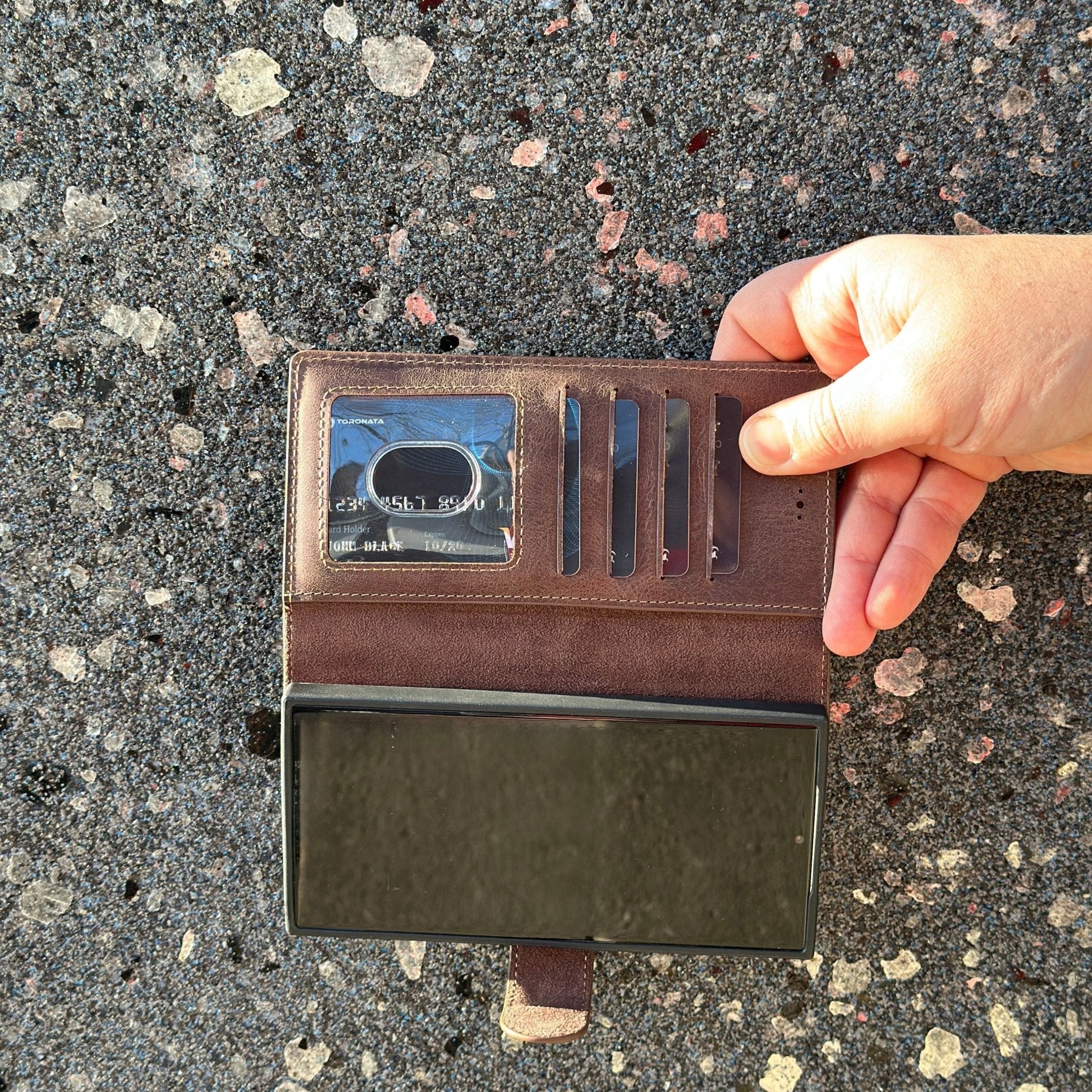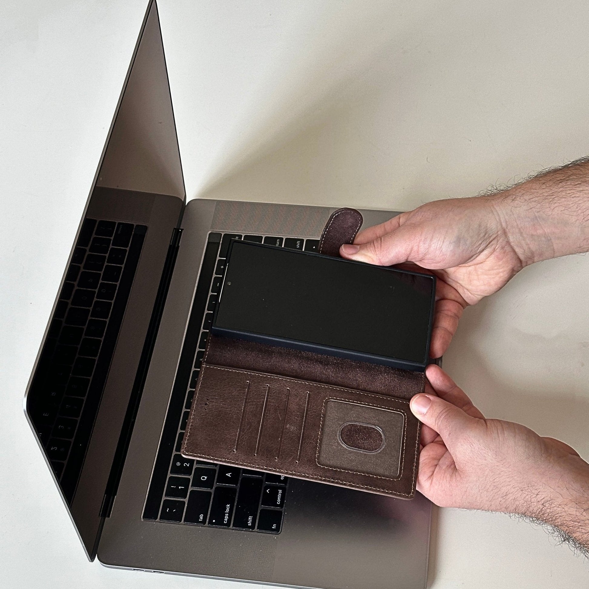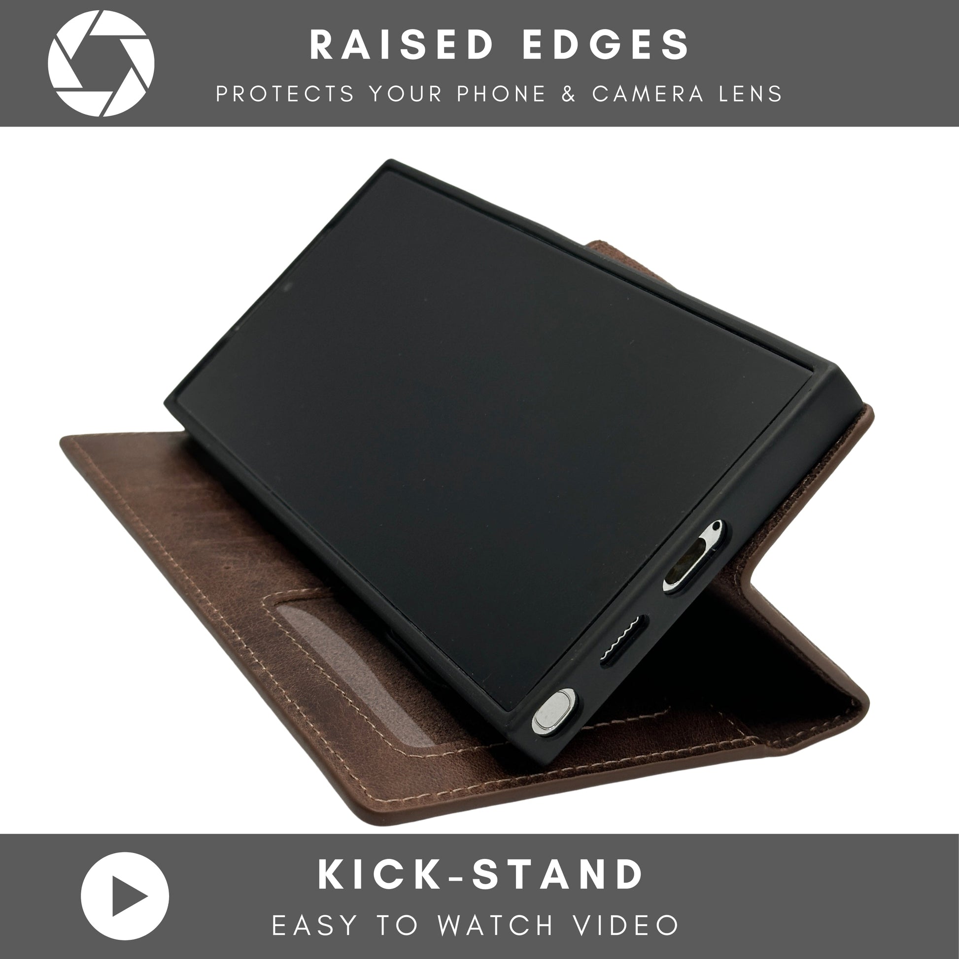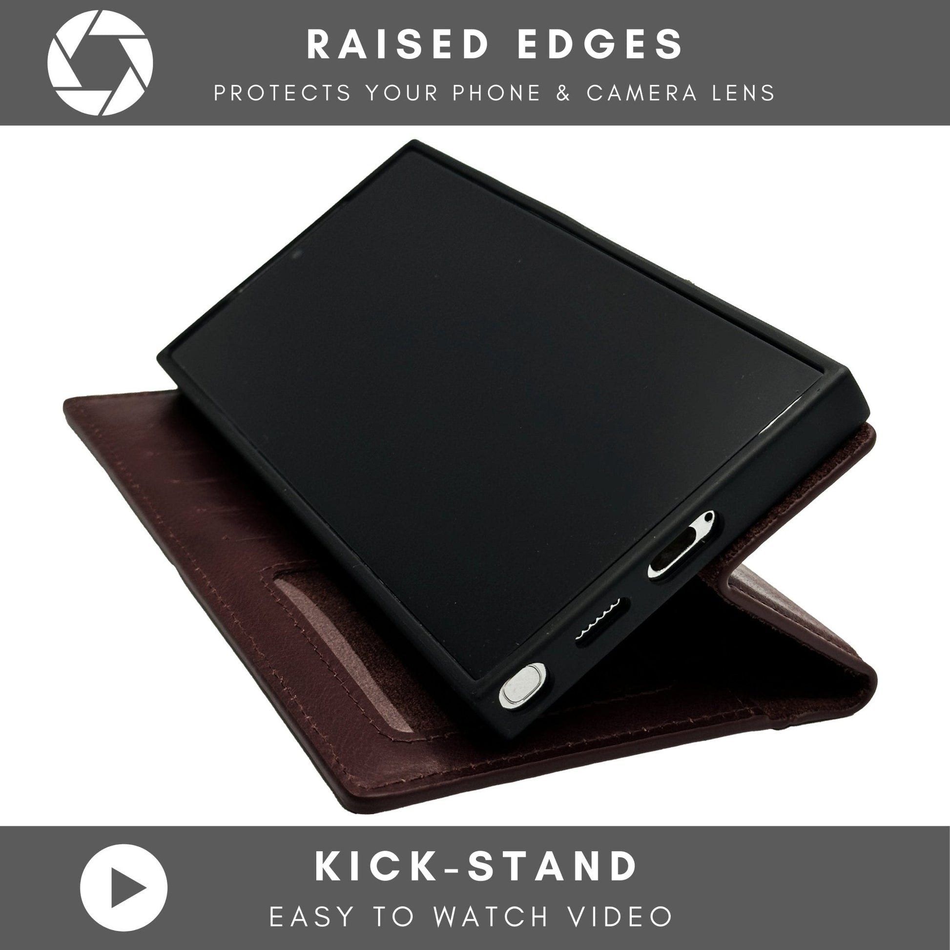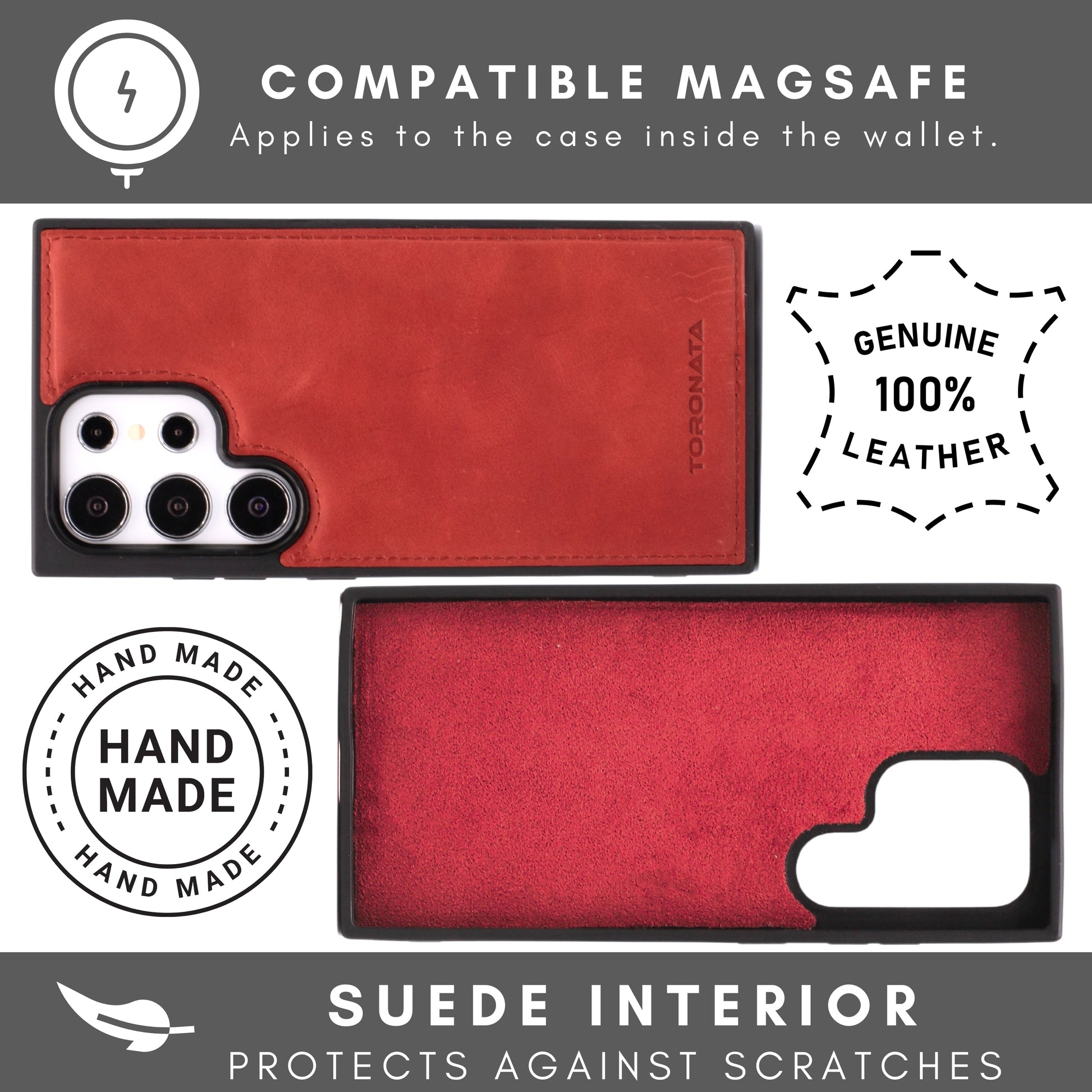 The TORONATA Nevada S24 Ultra leather wallet case was designed with the perfect balance between durability and elegance in mind, allowing you to enjoy the full features of your new smartphone without risking unwanted damage. Made with genuine cowhide leather, available in chic colors, with an anti-scratch anti-drop design that protects the device, plus 4 functional card slots and RFID technology, this S24 phone case converts into a kickstand, making it ideal for hands-free video calls, movies, and videos!