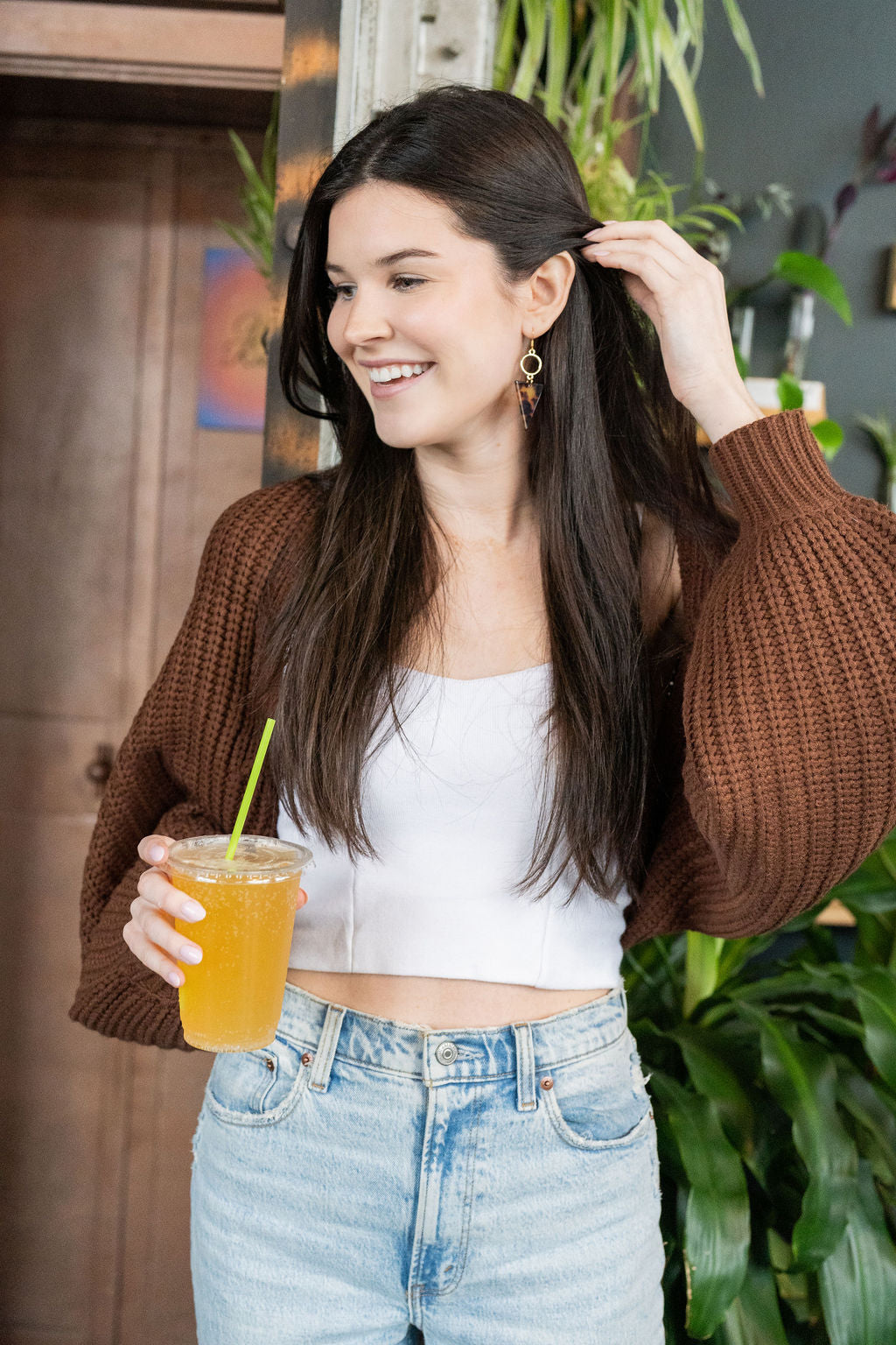 An eye-catching, minimalist style, these drop earrings are perfect for everyday wear. Featuring gold alloy and triangle acrylic charms, these earrings add a touch of edginess to any outfit.