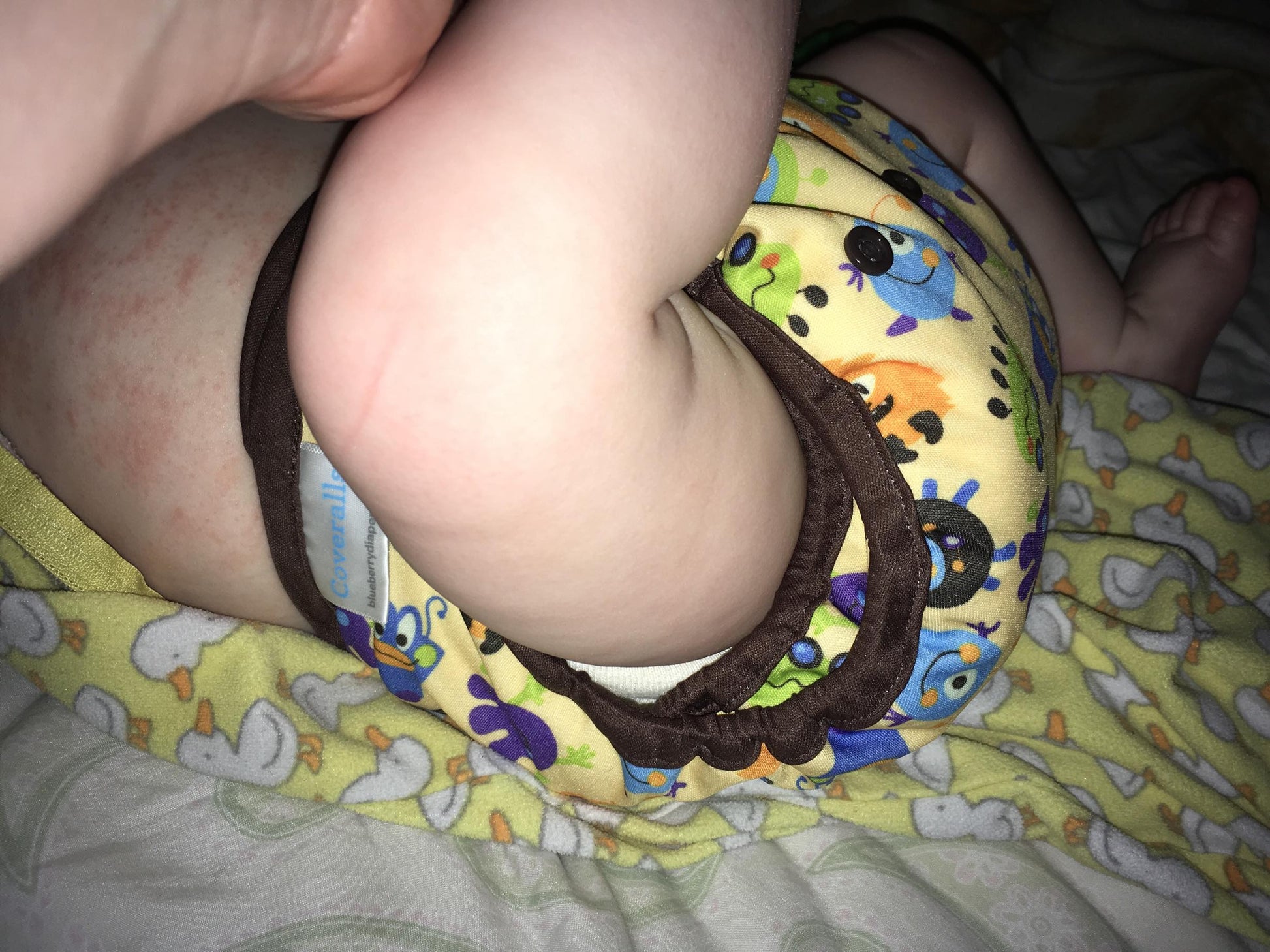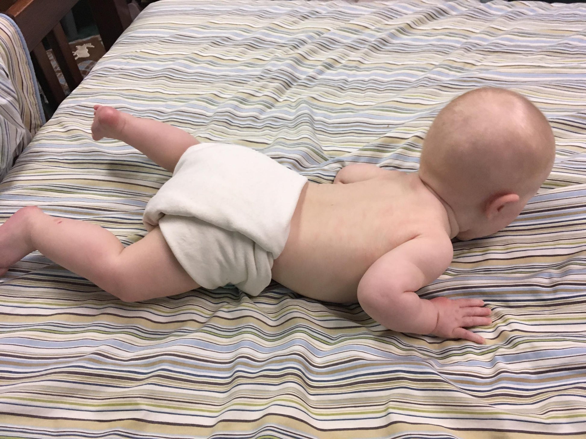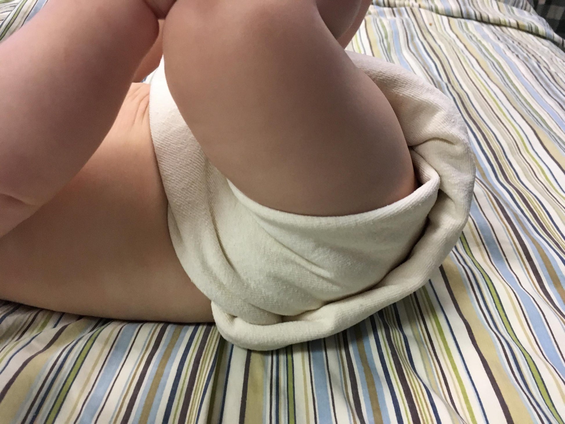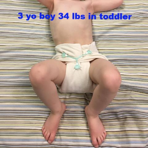 Toddler size 2 (30x30) works great if your baby is over 30 lbs, 20" in the waist, or needs a longer rise than the regular toddler provides.