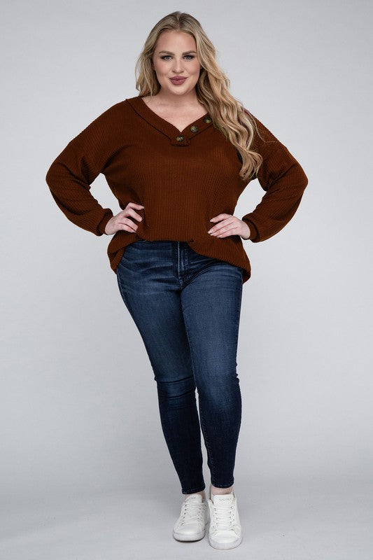 Introducing our Plus Brushed Waffle V-Neck Button Detail Sweater, the perfect blend of style and comfort for your fall and winter wardrobe. This sweater features a cozy waffle knit texture that adds depth and dimension to your outfit. The V-neckline is both flattering and classic, making it a versatile choice for various occasions. What sets this sweater apart is the button detail along the neckline, adding a touch of elegance and uniqueness to your look.