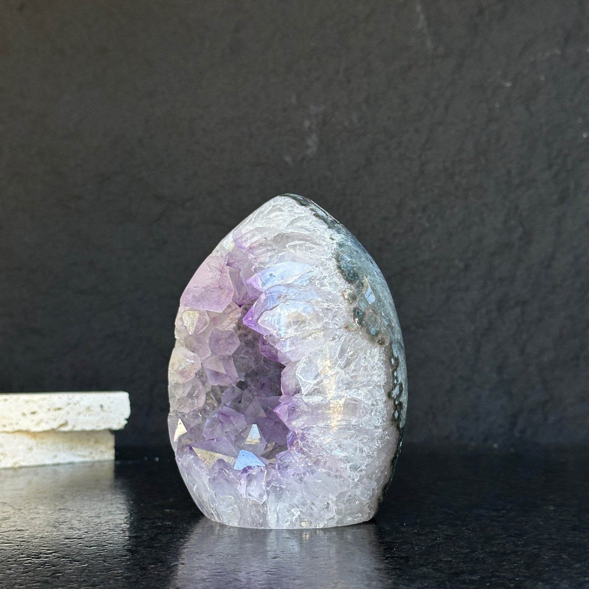 This quartz, amethyst and agate eggs is perfect for displaying in a reception table or desk.This crystal was made from natural amethyst stone from Uruguay. It was carefully polished at edges to show the wonderful agate formations.You will receive the egg pieces of the picture.MeasurementsHeight: 4.5 inchesWidth: 4 inchesWeight: 2.8 lb - 1272 gr