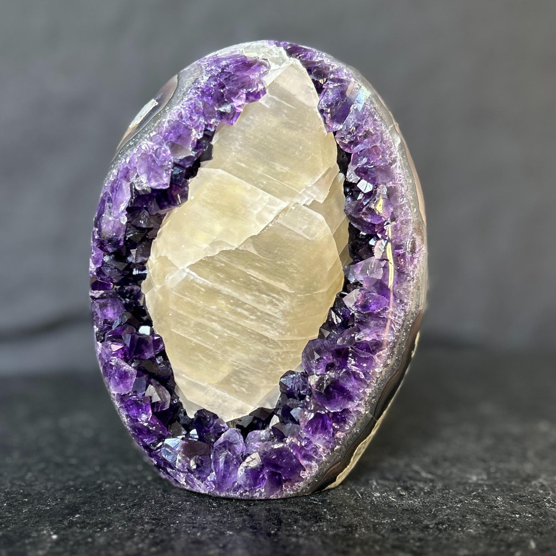 This incredible rare crystal formation comprise several minerals: amethyst, agate and calcite. This piece is perfect for displaying in large spaces.