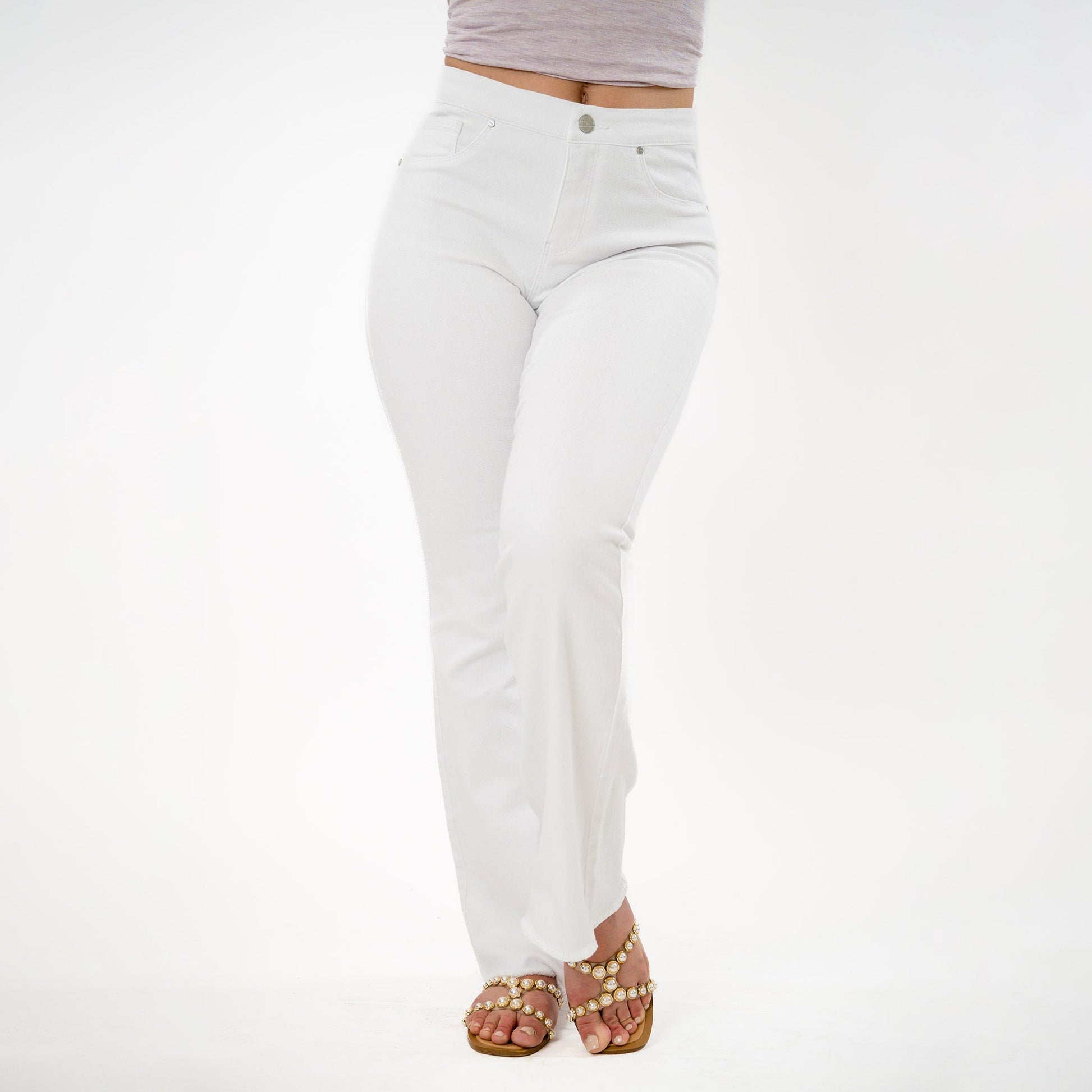 Get ready to turn heads in our Raw Hem Cropped Bootcut. Made from a thick denim twill, it gives off an air of sophistication with zero transparency. The patent pending adjustable waist by Cenia offers a flattering, customizable fit. Elevate your style today.