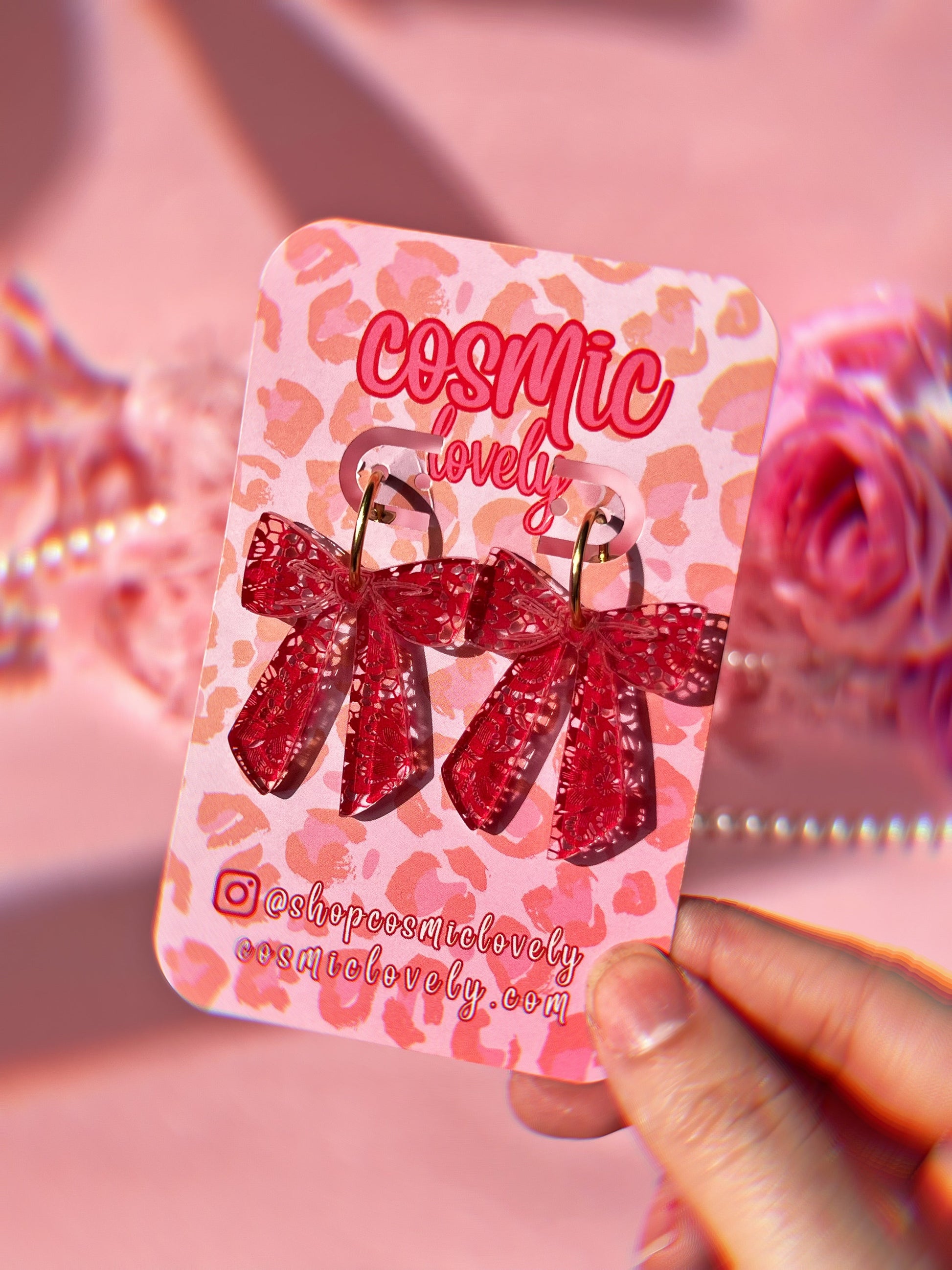 This listing is for ONE Pair of Red Lace Small Coquette Bow Earrings