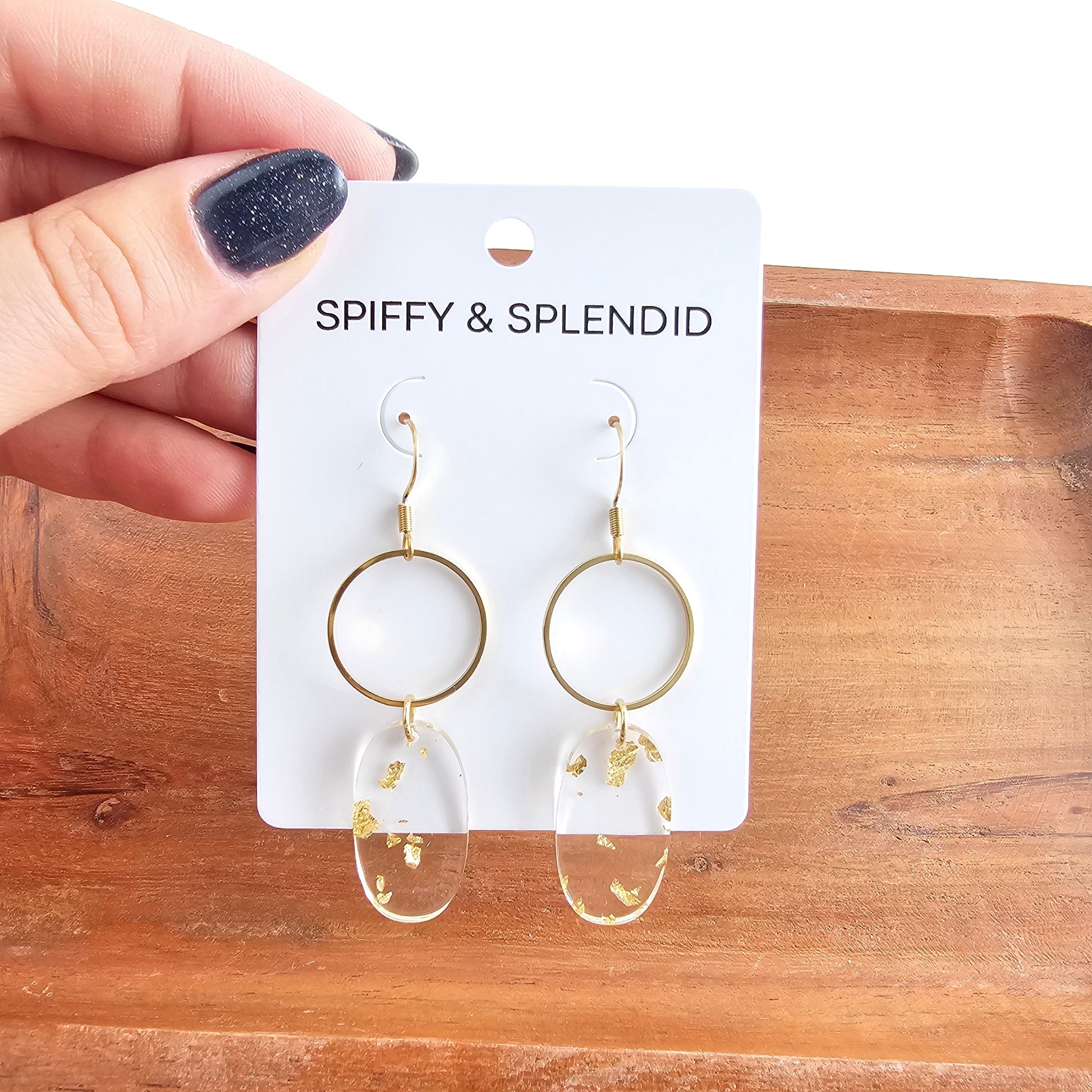 Accentuate any outfit with the stunning Rene Earrings. These dainty earrings feature clear acrylic charms in sparkling gold foil. Perfect for elevating your everyday look.