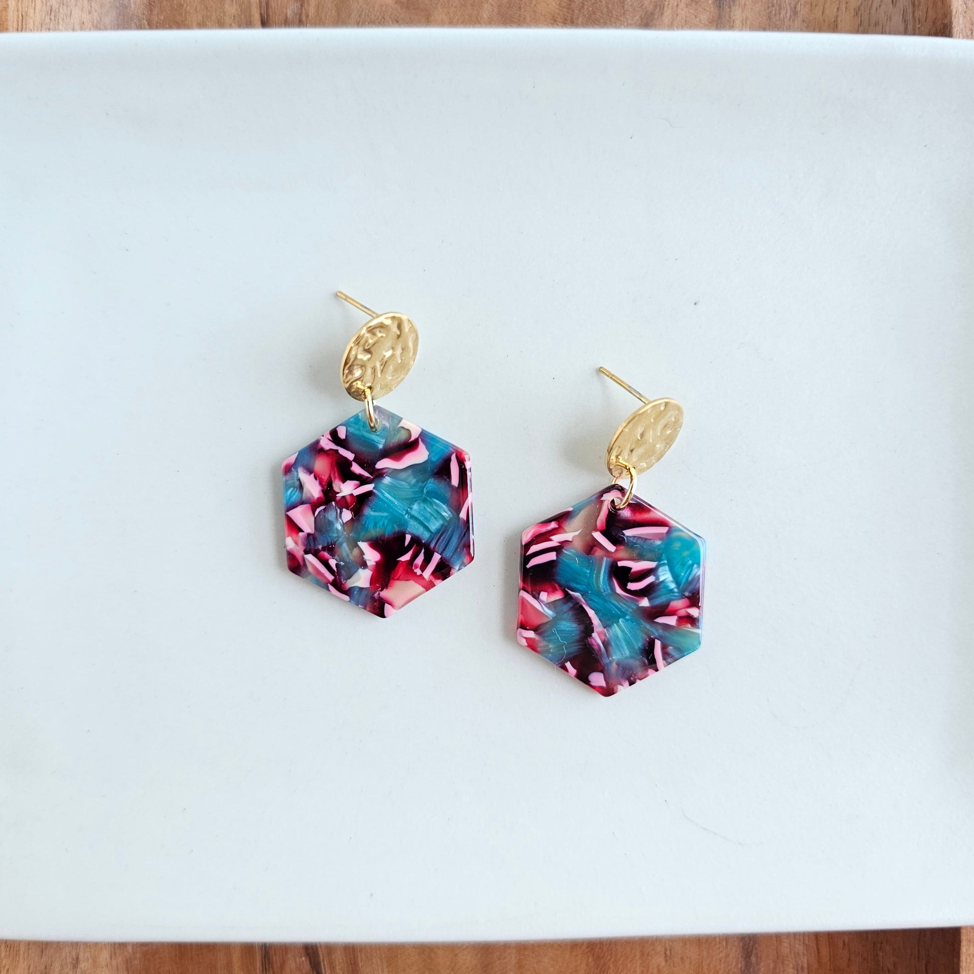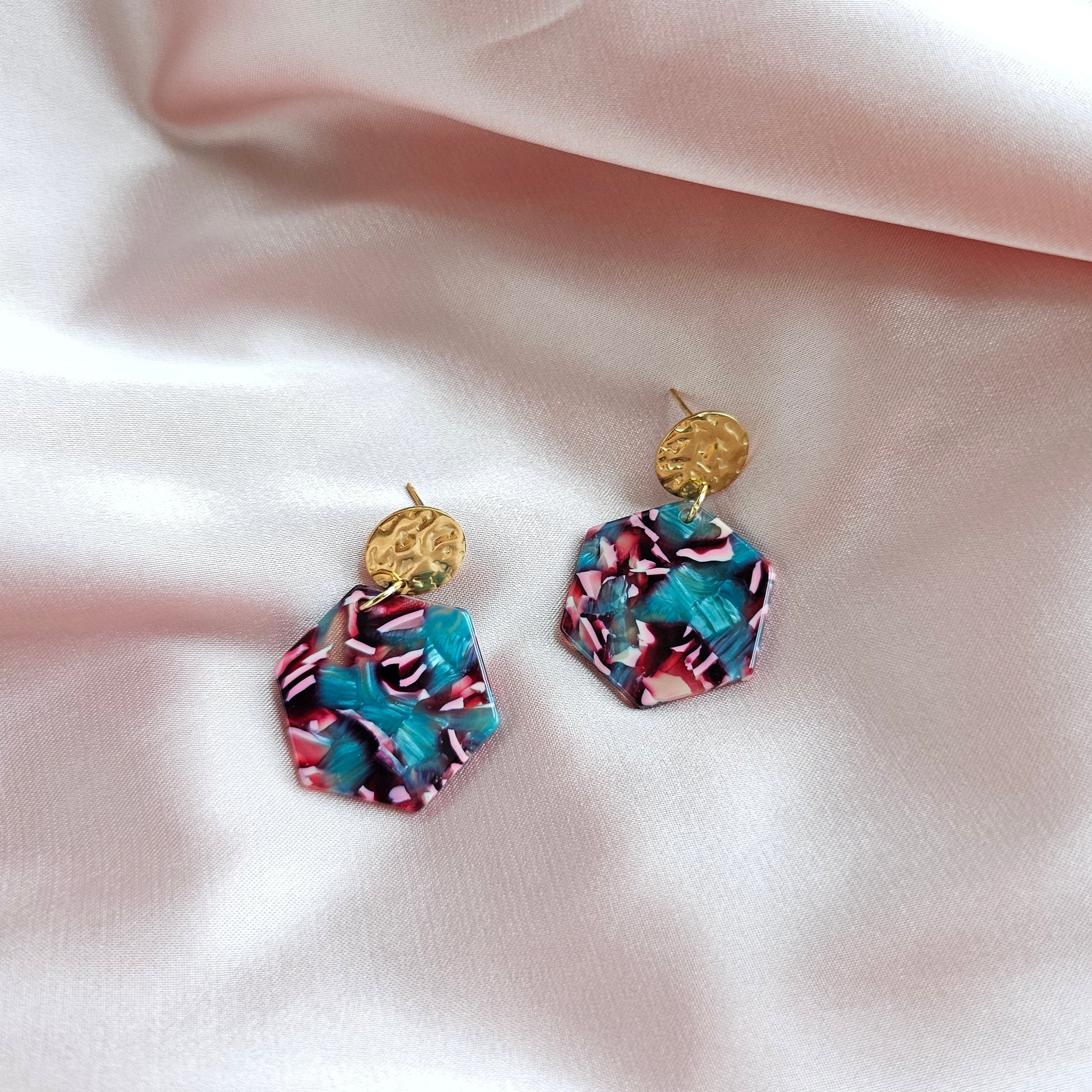 Rock your style with these eye-catching magenta and teal hexagon-shaped dangle earrings! Stylish and dainty, but still bold and daring, these earrings will help you stand out!