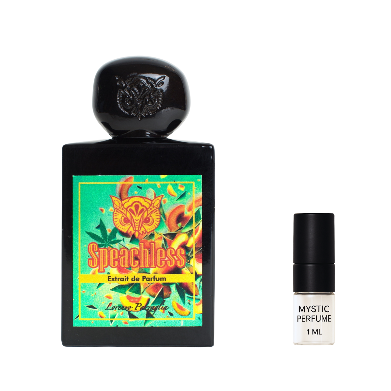 What it is: Speachless by Lorenzo Pazzaglia is a daring, fruity-citrus aromatic fragrance with a rebellious soul. Bursting open with an electrifying mix of bright citrus, juicy peach, and green tea, it evolves into a heart of floral nectar and herbs, then settles into a bold, earthy base laced with cannabis, patchouli, vetiver, and vanilla pod. It’s a scent that refuses to stay quiet — unapologetic, radiant, and unforgettable.