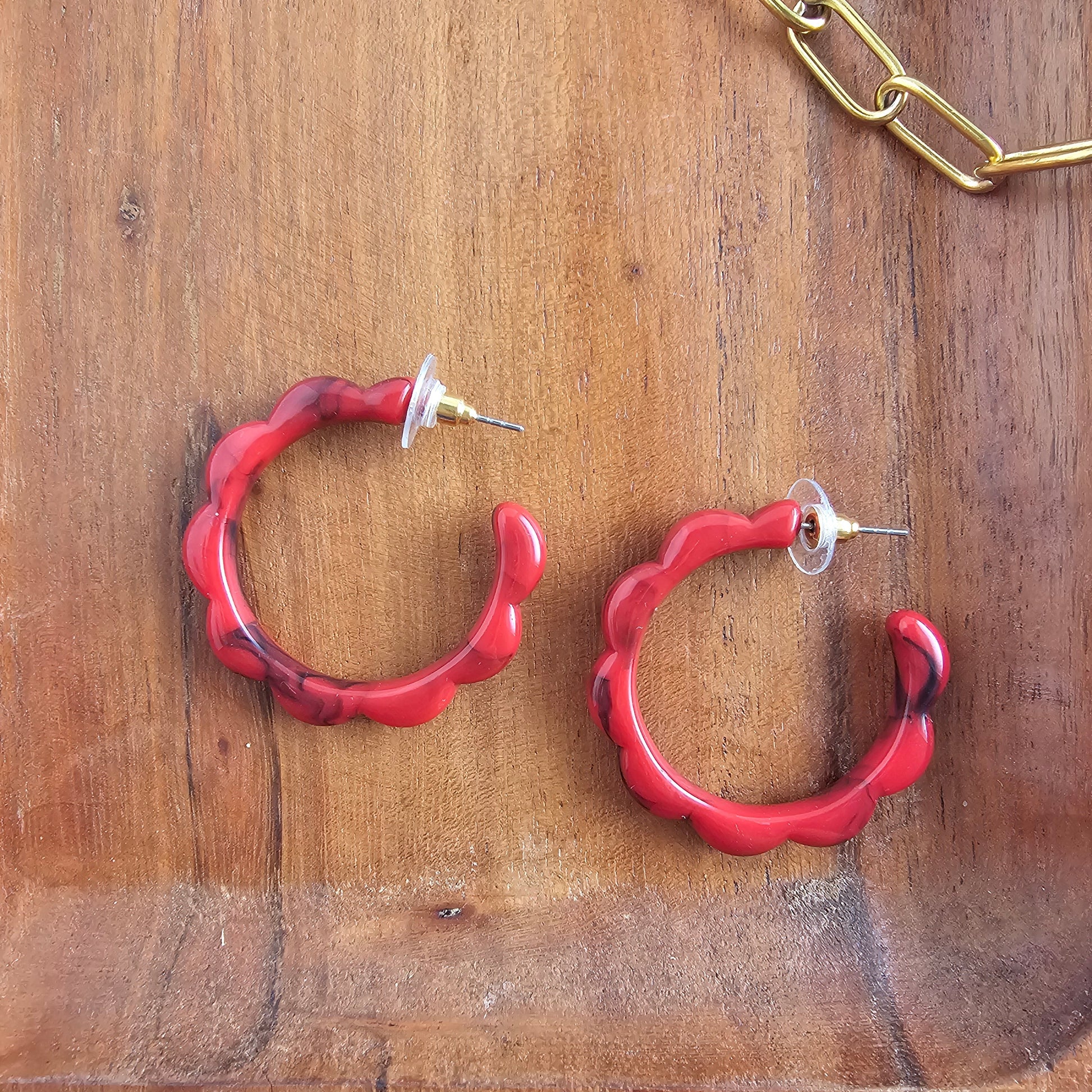 Bold, Playful, and Utterly Chic Our Scarlet Hoops are here to turn heads—in the prettiest way possible. Made from glossy resin and shaped in a unique scalloped silhouette, these hoops bring a modern twist to a classic shape. The rich crimson hue adds a pop of color that’s equal parts bold and wearable.