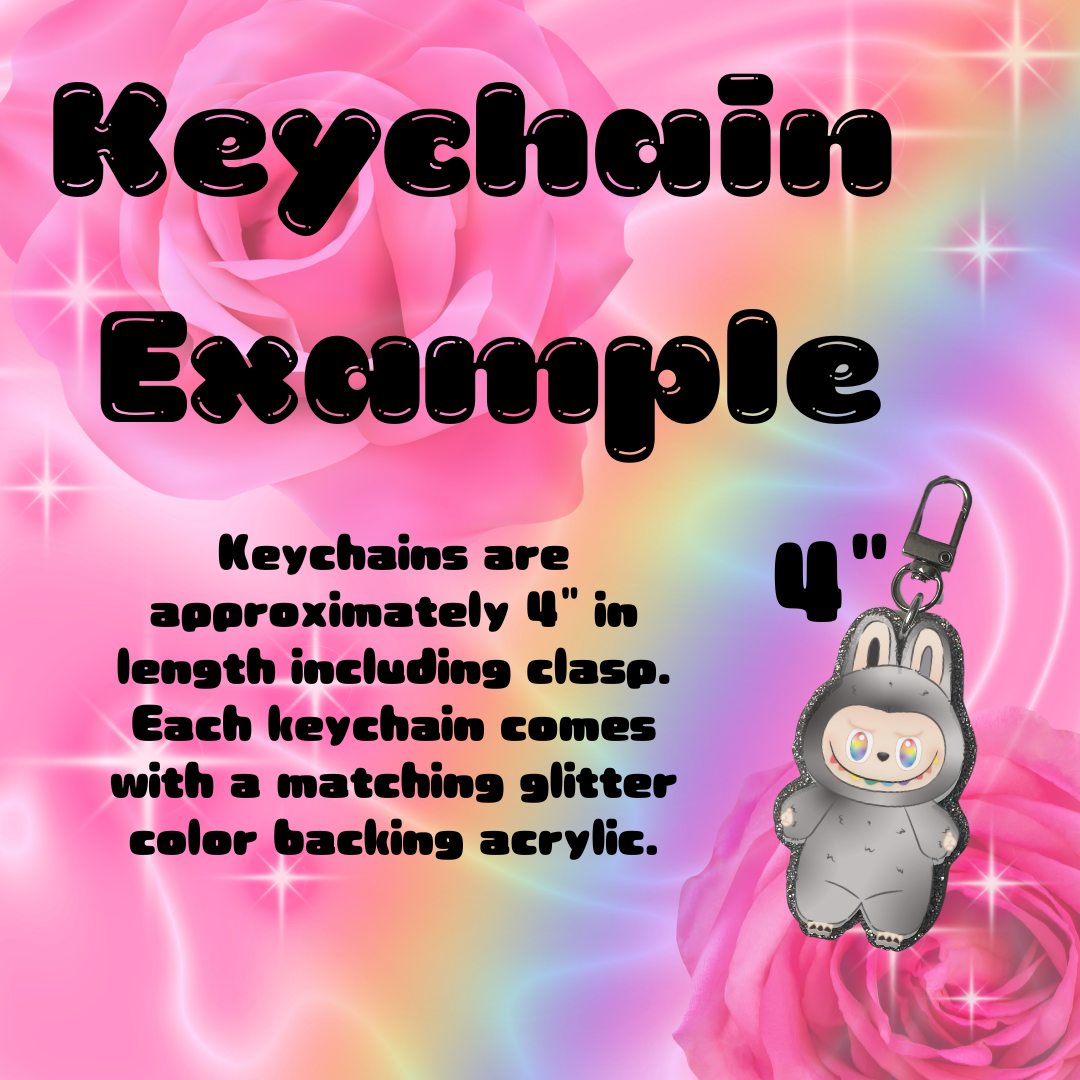 Keychains: Please see example photo. Due to the amount of variations I only have examples of how the keychains come. These Keychains are approximately 4" in length including clasp. Comes with matching color backing acrylic to make the keychain POP! like these example keychain.