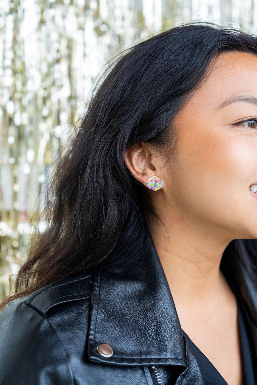 Our Sophie Studs are our classic circle-shaped stud earrings in a clear acrylic with glitter confetti