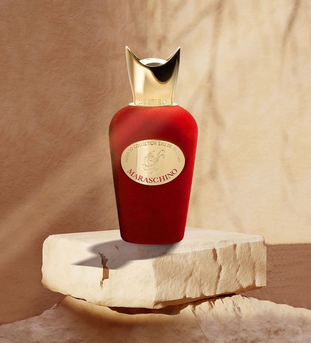 Fragrance story: 'Maraschino' embodies the luscious allure of the sweet symphony of Red Cherries, tempting Almonds, ripe Strawberries, juicy Apples, and velvety Peached that compose an exquisite overture, evoking the vibrant hues of a sunrise.
