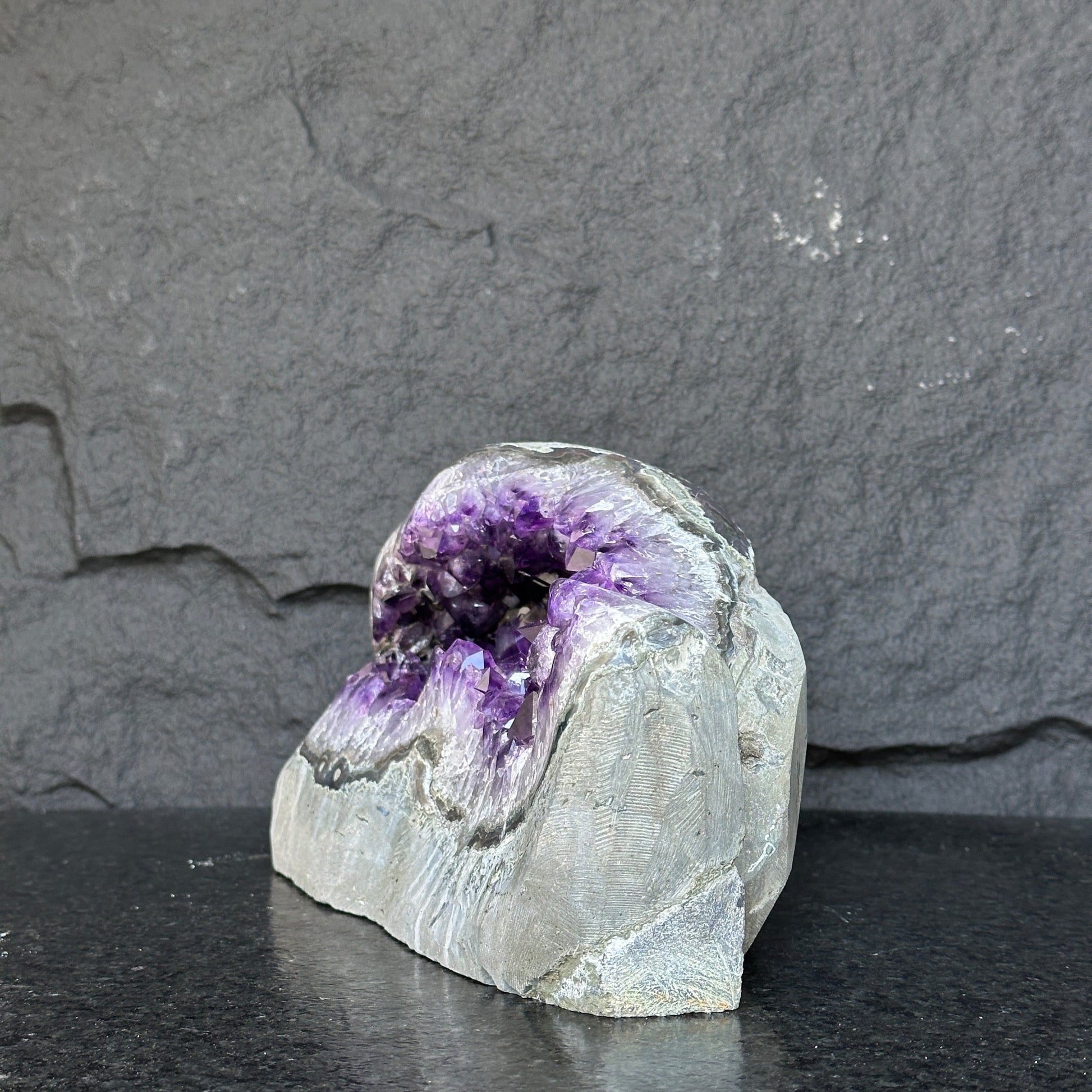This crystal piece is made from natural amethyst stone from Uruguay. It was carefully polished at edges to show the wonderful agate formations.