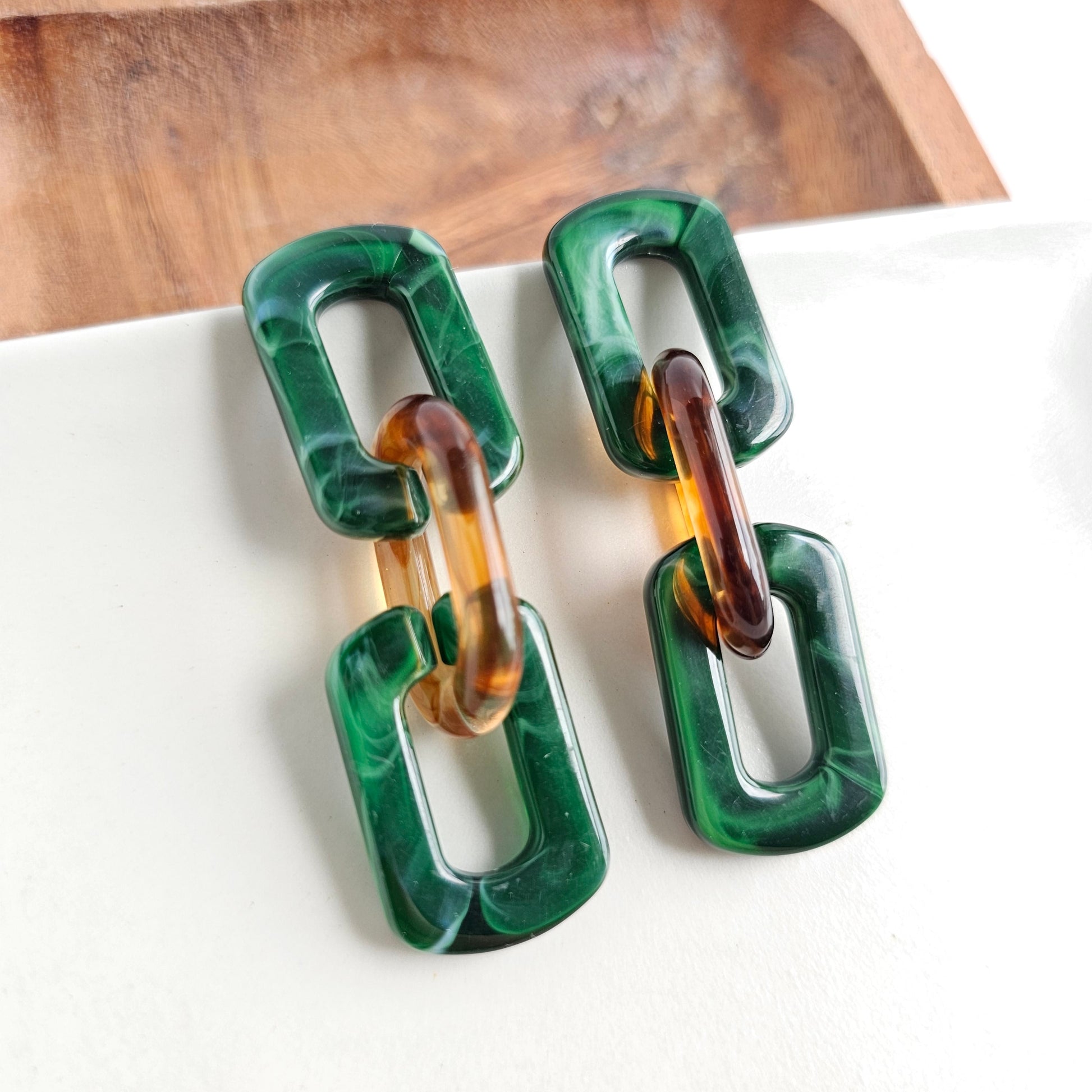 Take your style to the next level with Tabitha - the latest in chunky, chain link style earrings. Featuring a vibrant forest green and amber combination, these bejewelled beauties are sure to turn some heads. These stunning statement earrings will be the perfect finishing touch to your ensemble. Ready, set, SHINE!