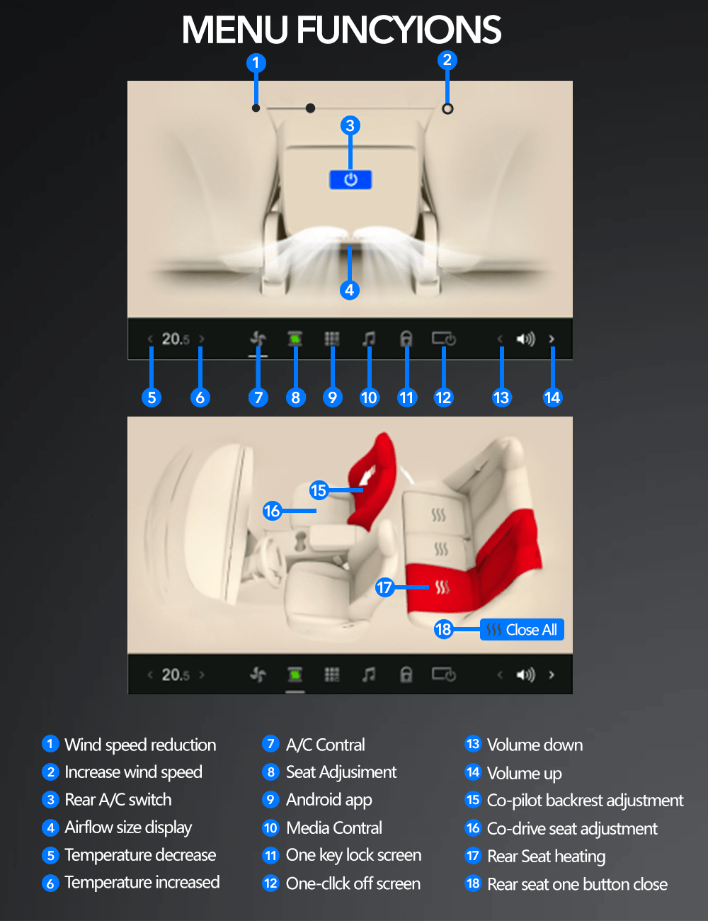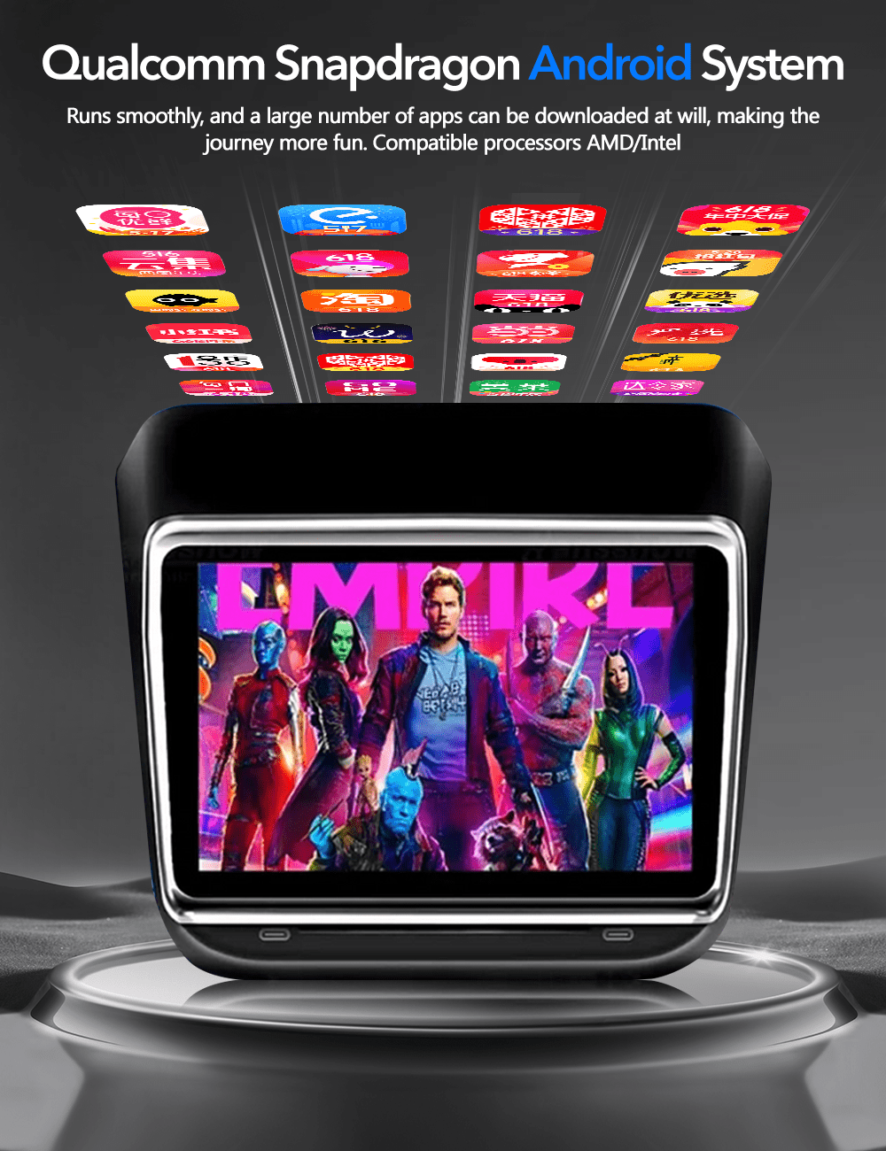 Material: ABS+PC Screen size: 7.5 inches Screen material: IPS true color display Resolution: 1920*1200 Running memory: 4+64G Function: intelligent control, entertainment system Processor AMD and intel compatible 2 Type-C Operating system: Qualcomm Snapdragon Android system RAM: 4GB, RAM: 64GB Rear air conditioner, temperature adjustment by zone; seat heating, rear control; seat massage, relieve fatigue; adjustment function; control the volume of the front host unit up and down; network HD TV to watch live broadcast at any time; Android system, free download; dynamic air conditioning UI , high-end technology; can insert SIM card, U disk playback, plug and play; interact with the main screen; supports 4G network and WIFI Internet access.
