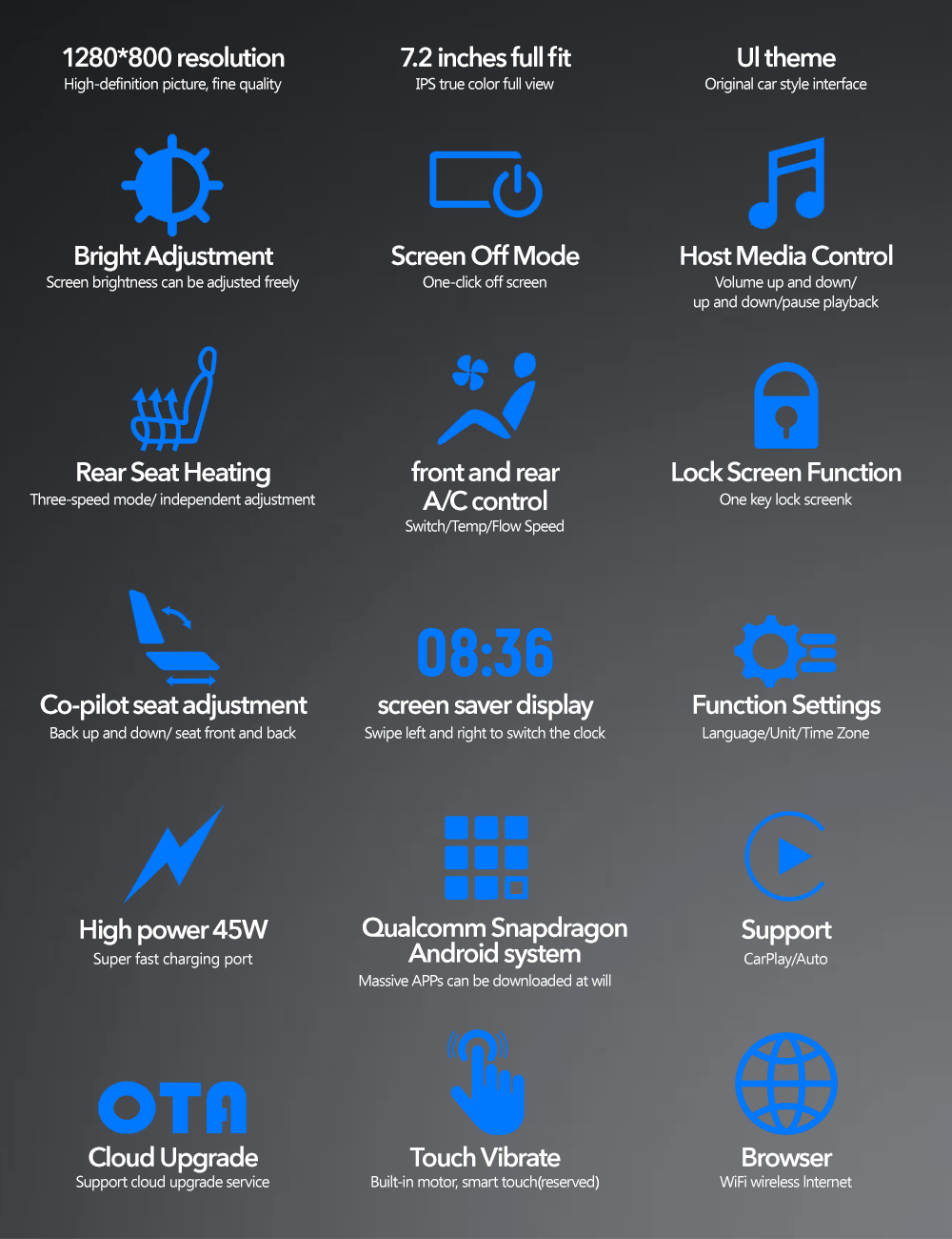 Material: ABS+PC Screen size: 7.2 inches Screen material: IPS true color display Resolution: 1280*800 Running memory: 2+32G Function: intelligent control, entertainment system Processor AMD and intel compatible 2 Type-C Operating system: Qualcomm Snapdragon Android system RAM: 2GB, RAM: 32GB Host media control; rear seat heating; passenger seat adjustment; front and rear air conditioning control; screen lock function; super fast charging interface 45W; support carplay/auto; cloud upgrade service, touch vibration (reserved); can not insert SIM card; supports WIFI wireless Internet access, does not supports 4G network