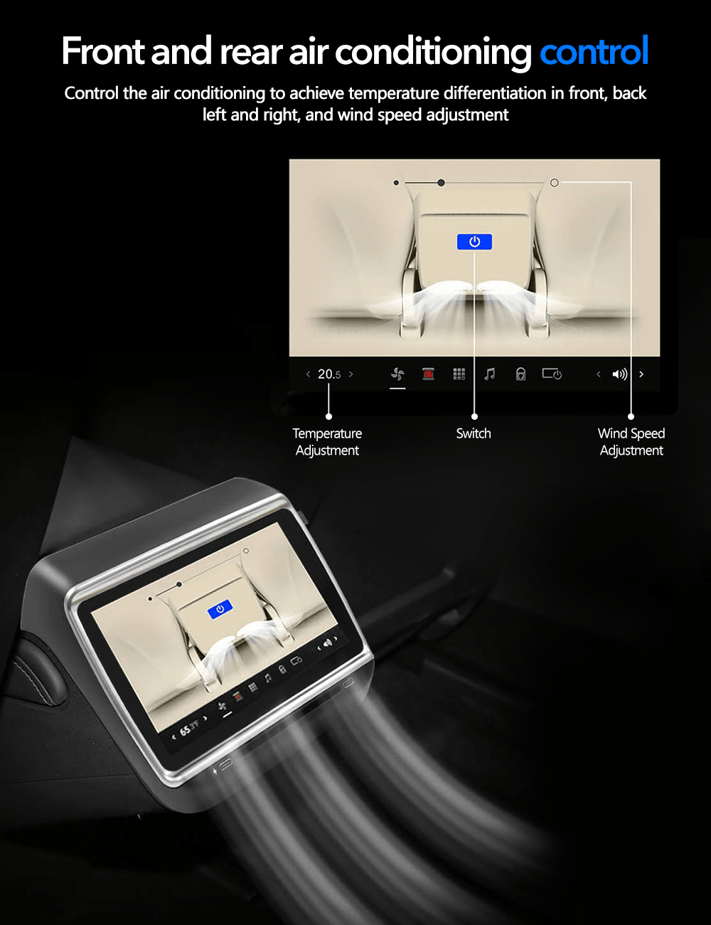 This screen runs on the Android 11 OS and comes fully featured with the Play Store. The screen talks to your Tesla to control essential functions for rear passengers that have not been available before!
