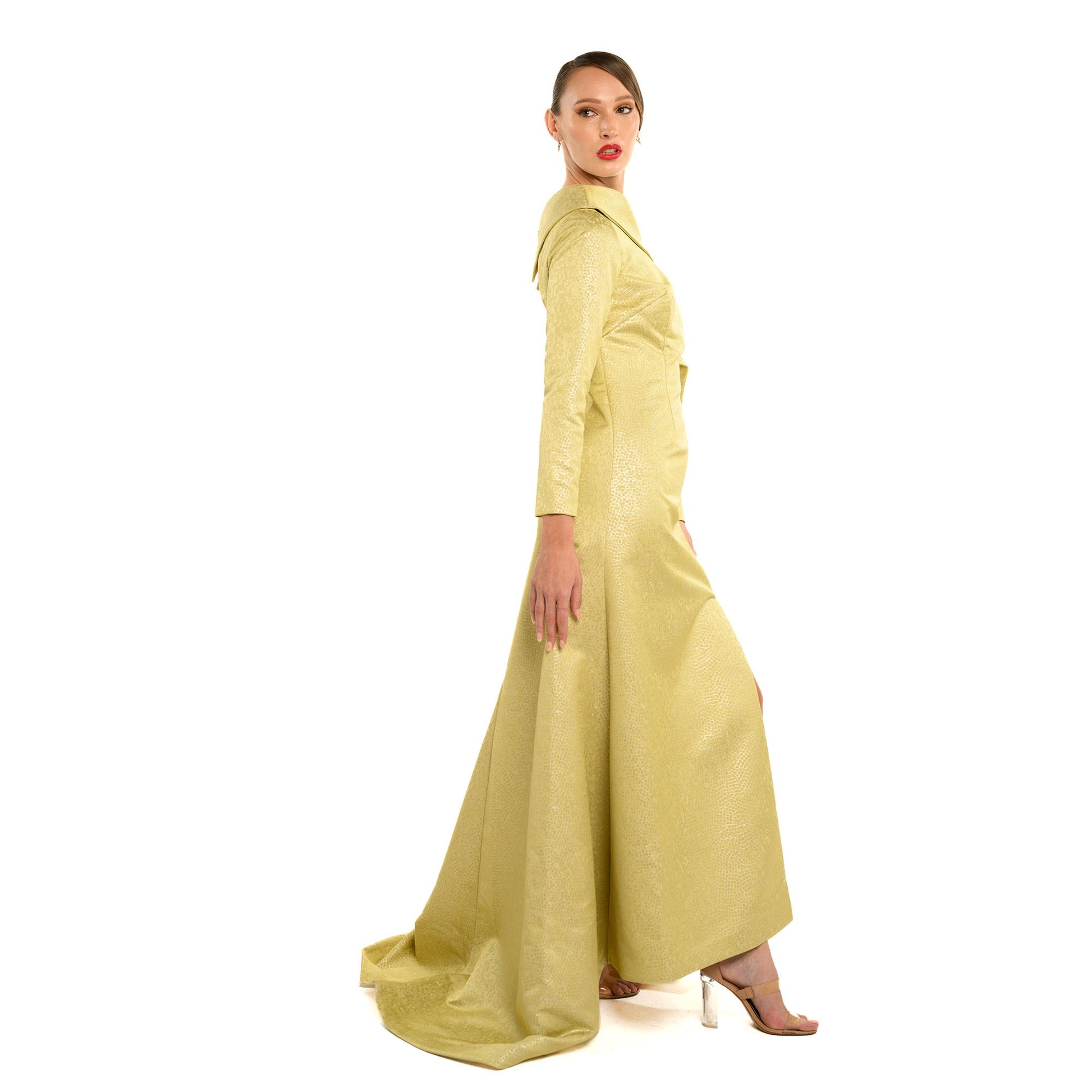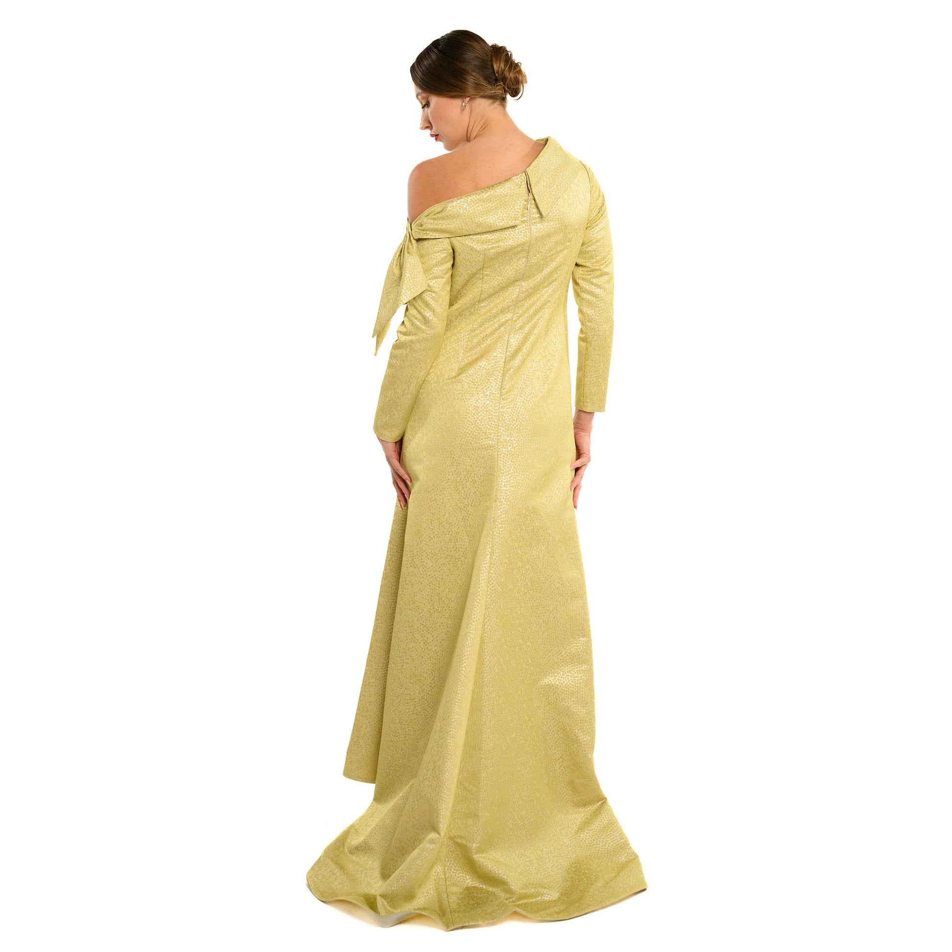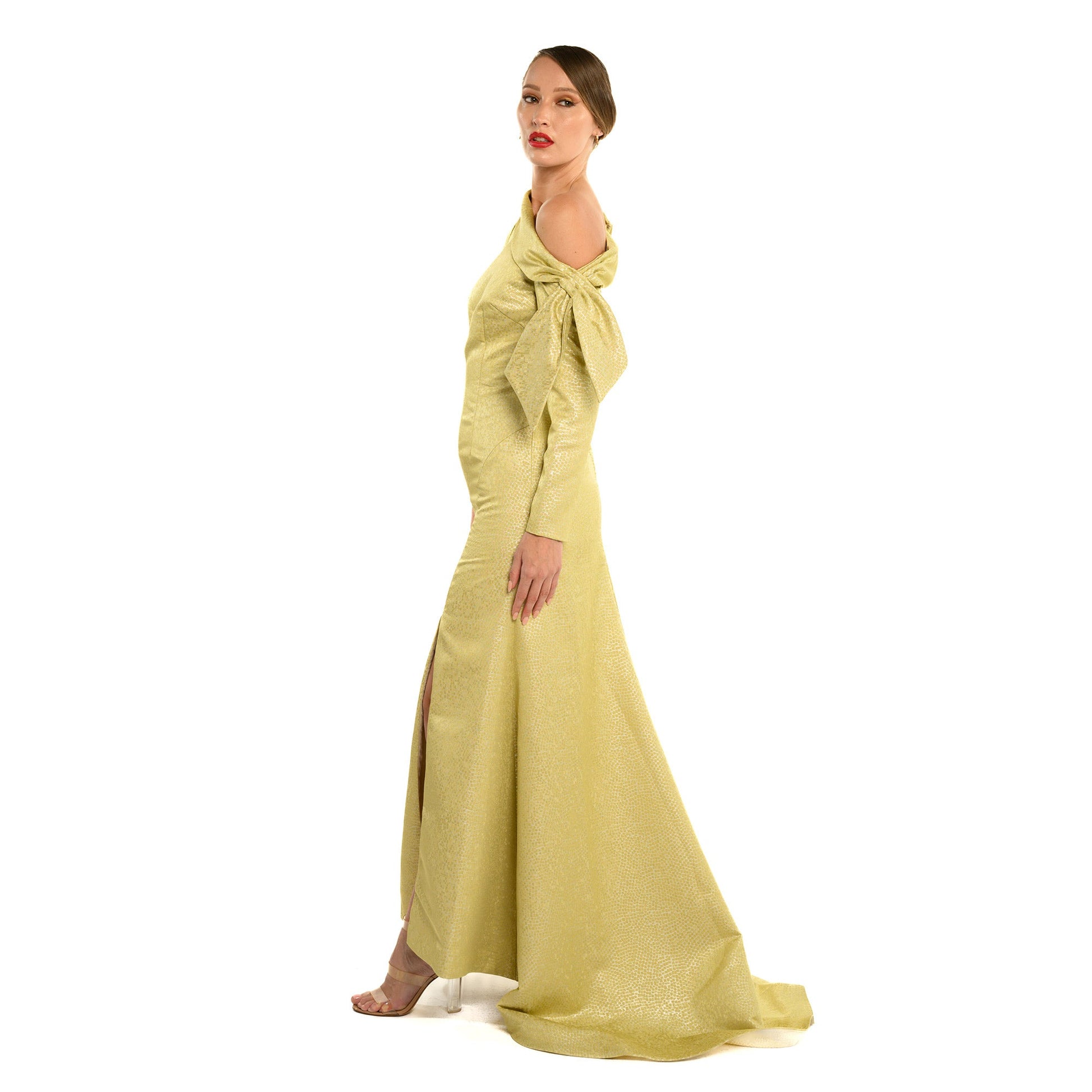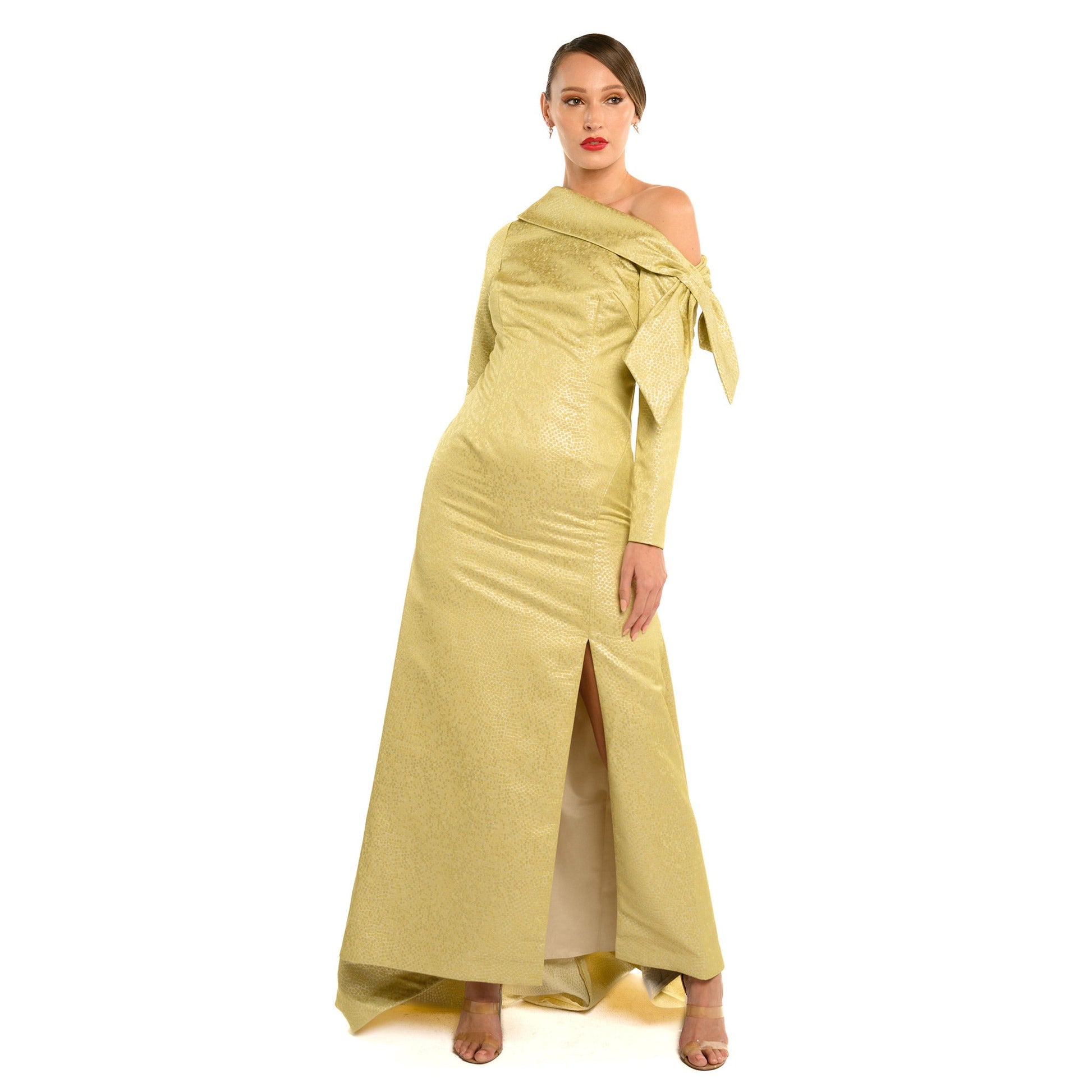 Look sensational in The Bacall's Asymmetric Mock Neckline Side Bow Gown. Crafted with Novelty Jacquard Fabric in a soft mustards hue, this timeless masterpiece features a dip hem design and right leg slit for a riveting contrast. An exposed neckline and statement bow add sophistication, while its bold design is perfect for turning heads at any special occasion. Step out with confidence and feel beautiful in this exquisite gown.