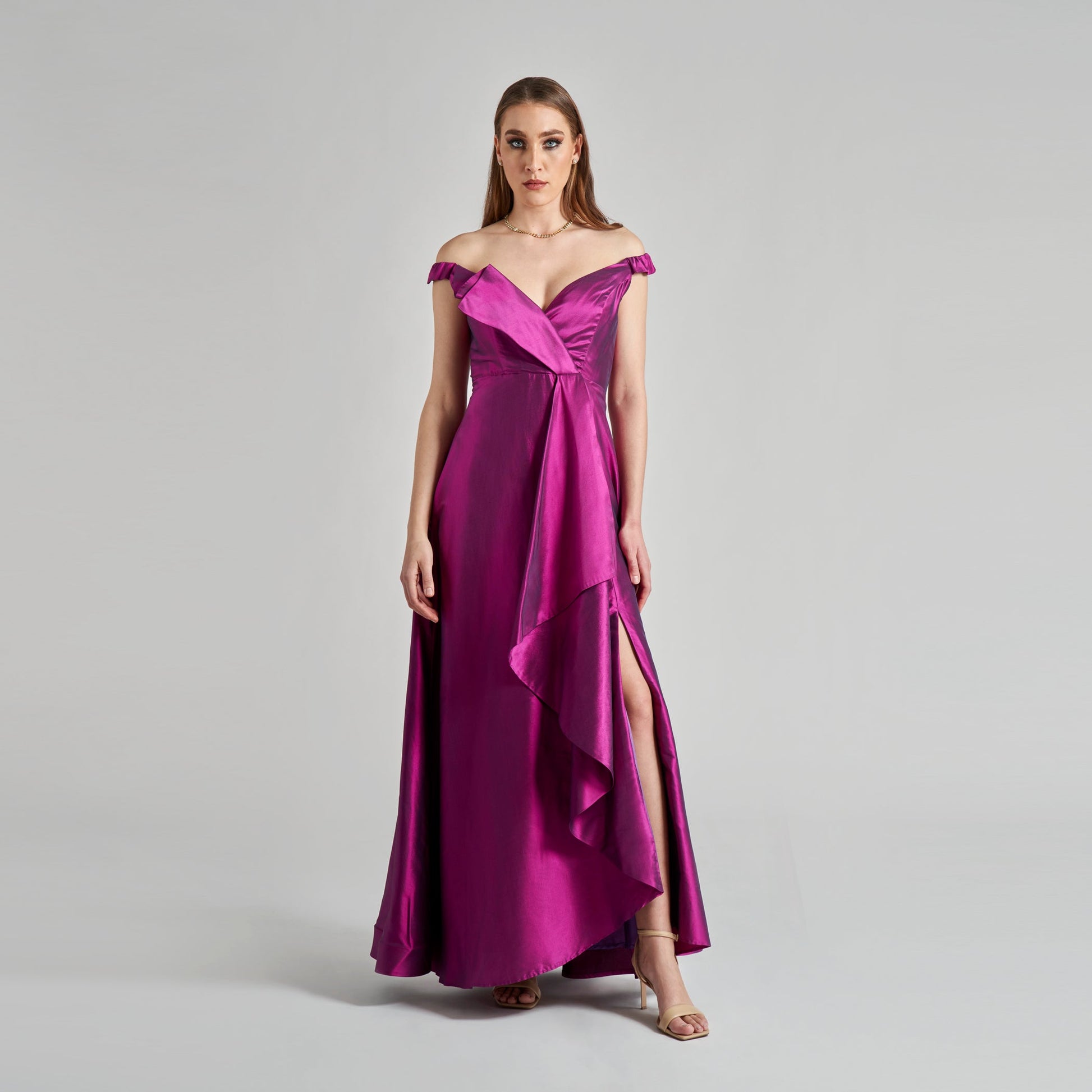 The Elizabeth is a beautifully crafted dress with an extraordinary origami-inspired asymmetric bodice. The elegant flounce and luxurious silk iridescent shantung fabric exude sophistication, while the slit on the skirt adds a touch of refinement to the overall look.