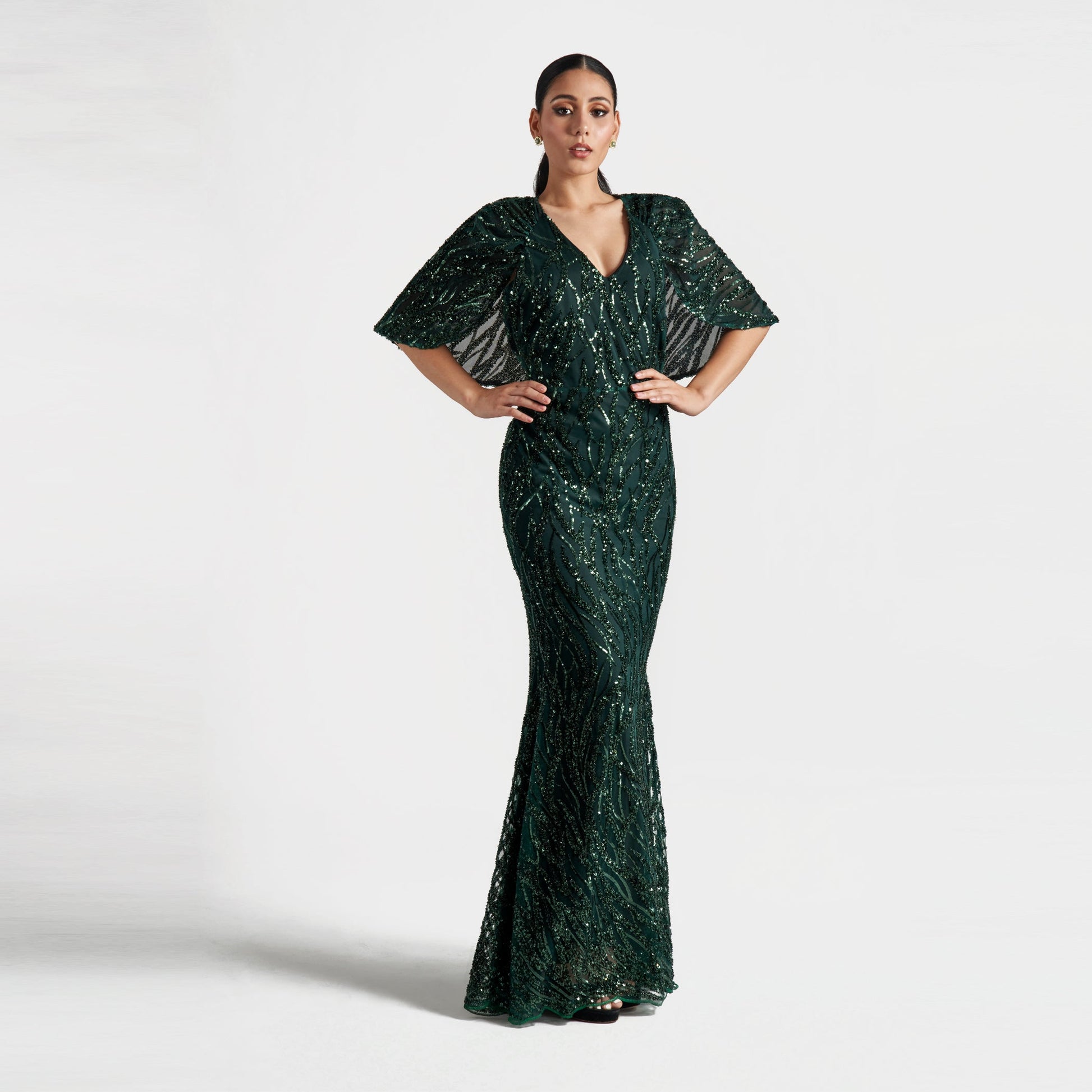 Indulge in pure luxury with The Kate. This stunning capelet gown features an exquisite beaded mesh, delicately ending in a scalloped border. The low back neckline is adorned by a sheer capelet, starting from shirred sleeves at the front. Exude elegance and sophistication in this impossibly chic piece.