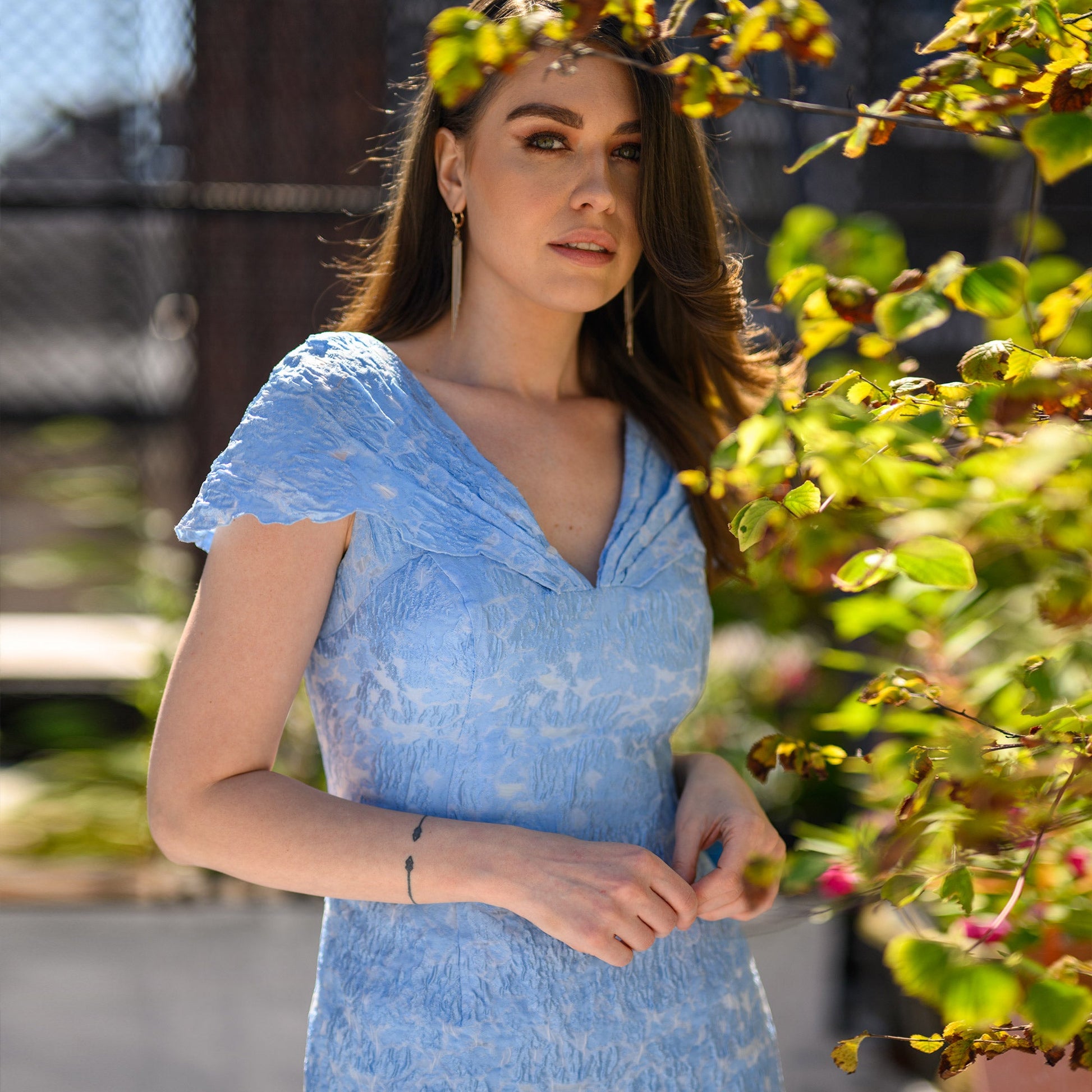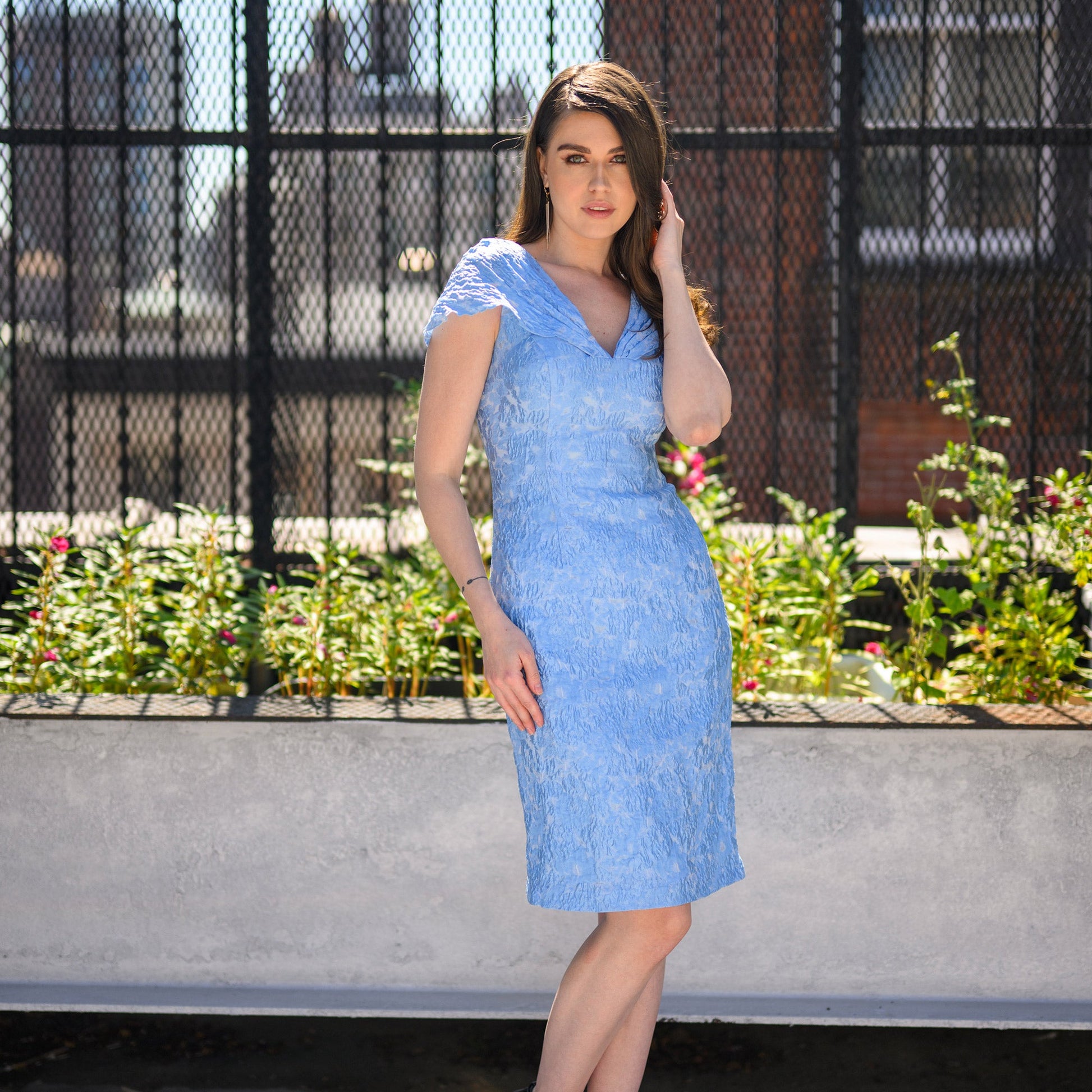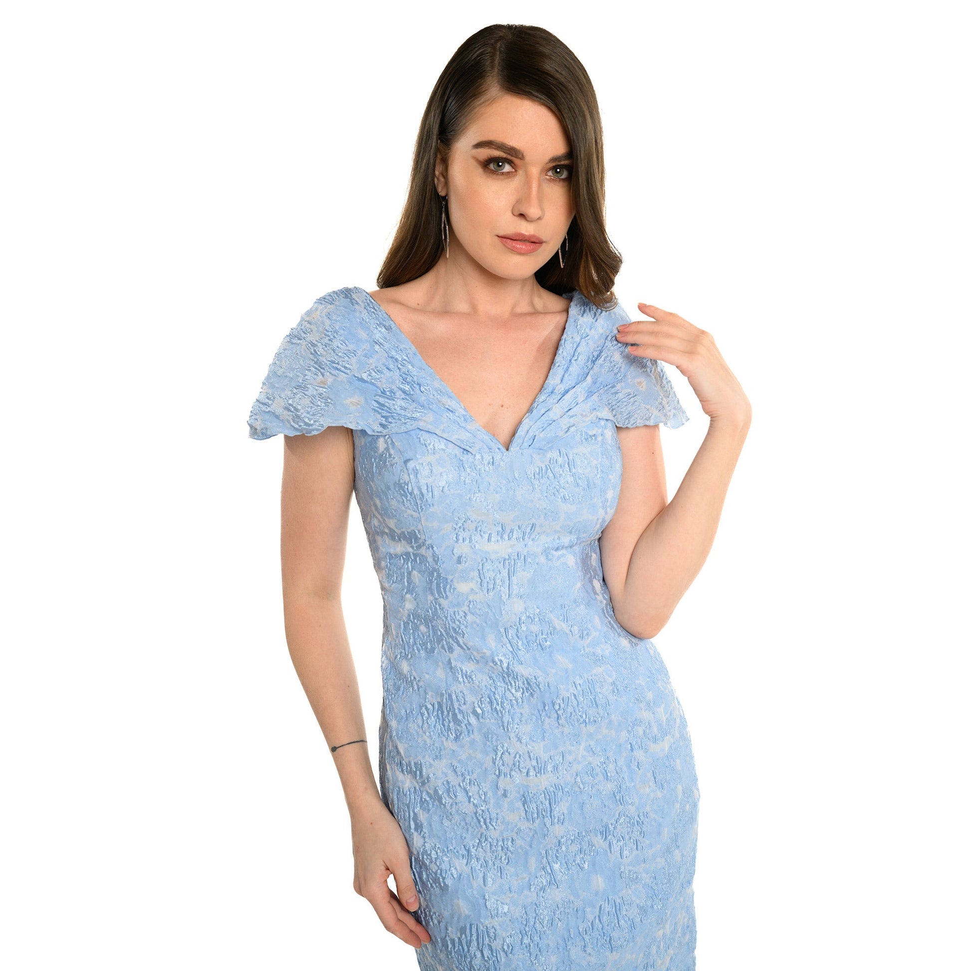 Crafted with an eye for detail, The Margaret is a stunning blue dress that features a plunging neckline and customized short sleeves for a modest yet sophisticated appearance. Its high-quality Novelty Burnout Jacquard fabric gives it a luxury feel that works for both dinning and special occasions. The Margaret will give you an elegant look for any event.