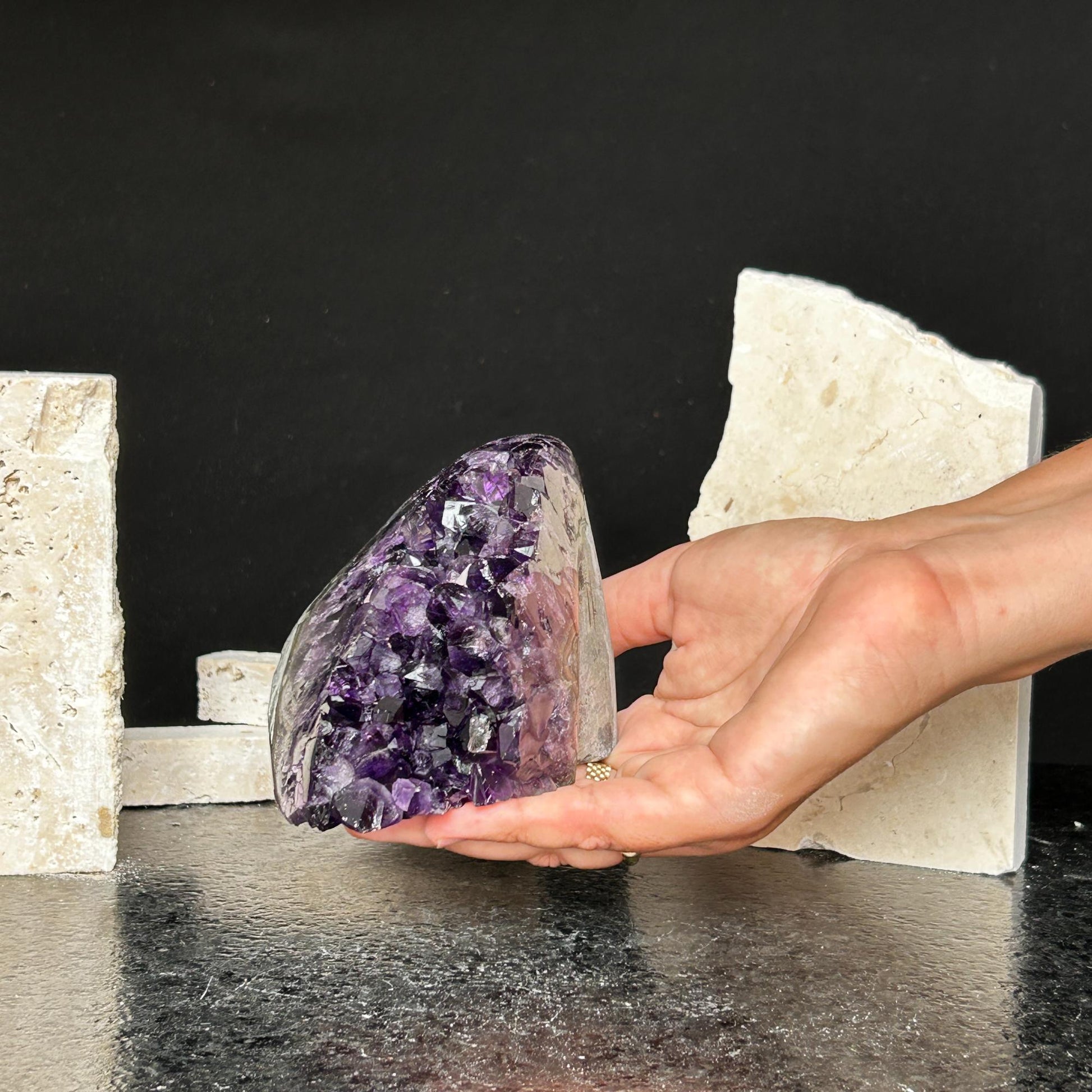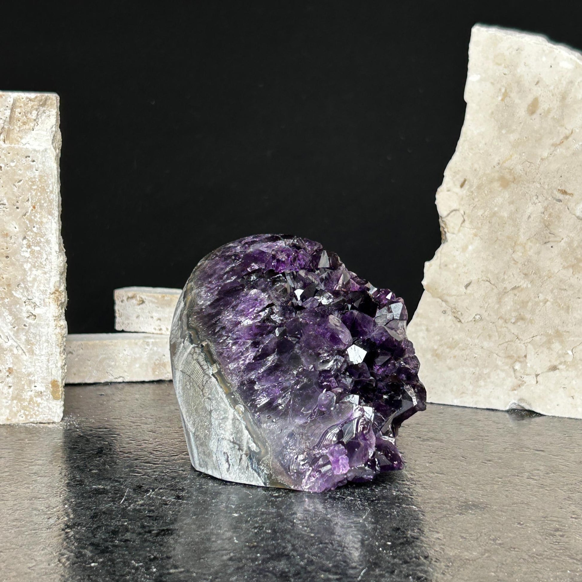 This amethyst crystal cluster has the highest quality of the semi precious stones. The deep purple shades with agate formations becomes this piece in a unique amethyst geode.