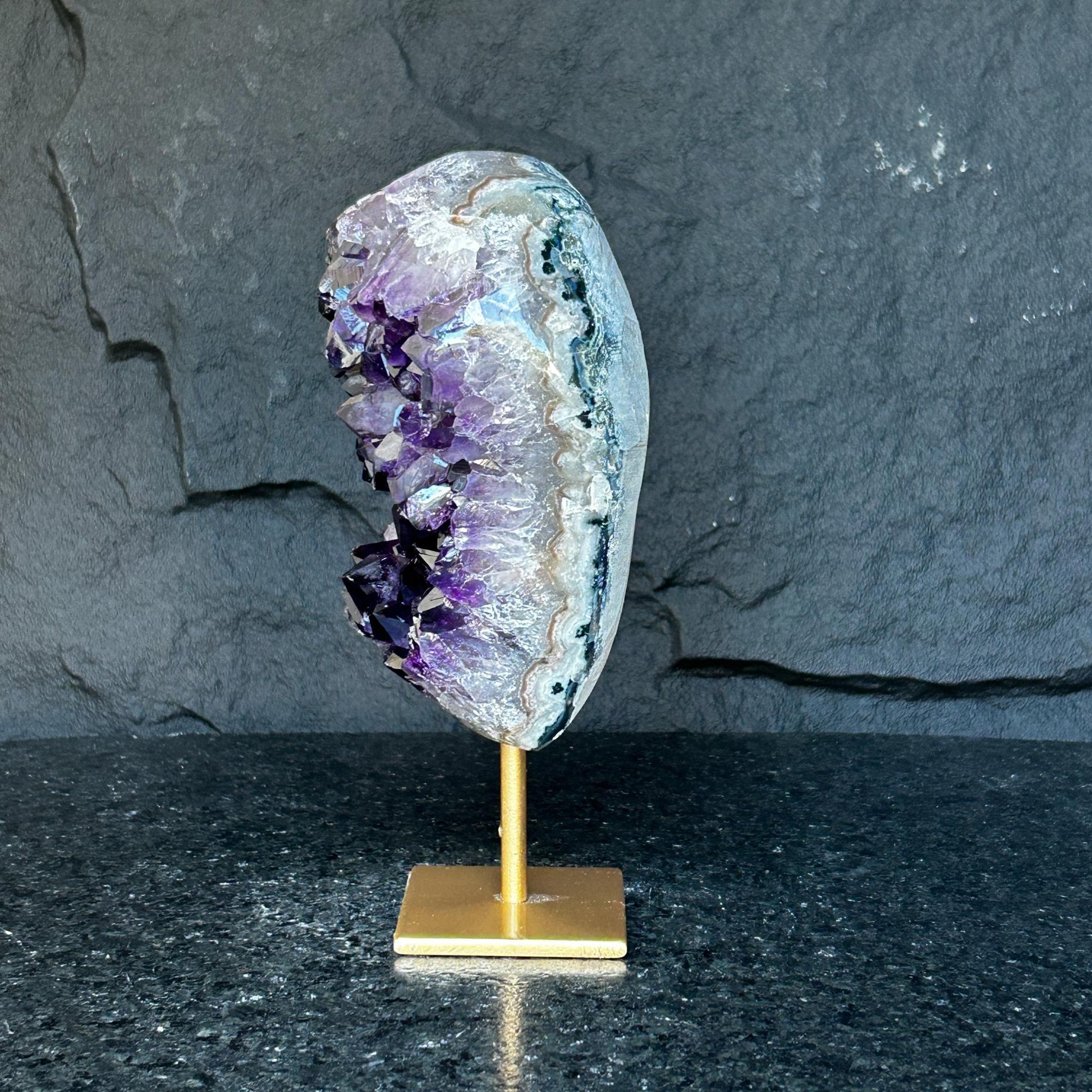 This incredible amethyst geode with metal stand has a unique shape. This specimen is gorgeous from any angle, perfect for displaying in an entry table or library. It will look great from any location in the room.