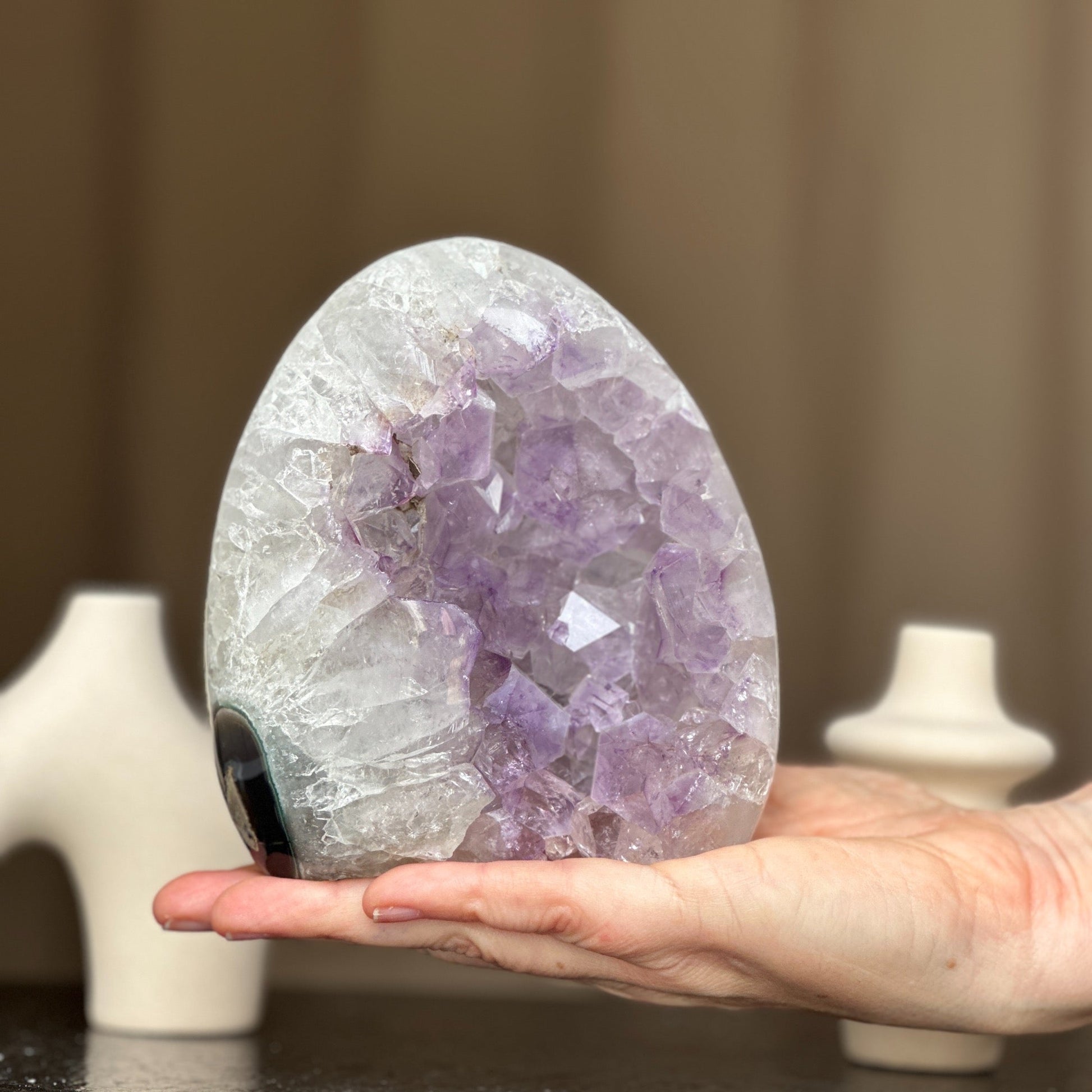 This white quartz and agate geode cave is perfect for displaying in a reception table. It's an extra large piece, a unique specimen.