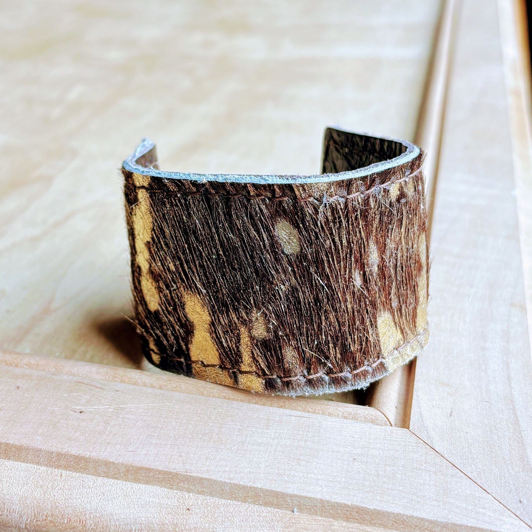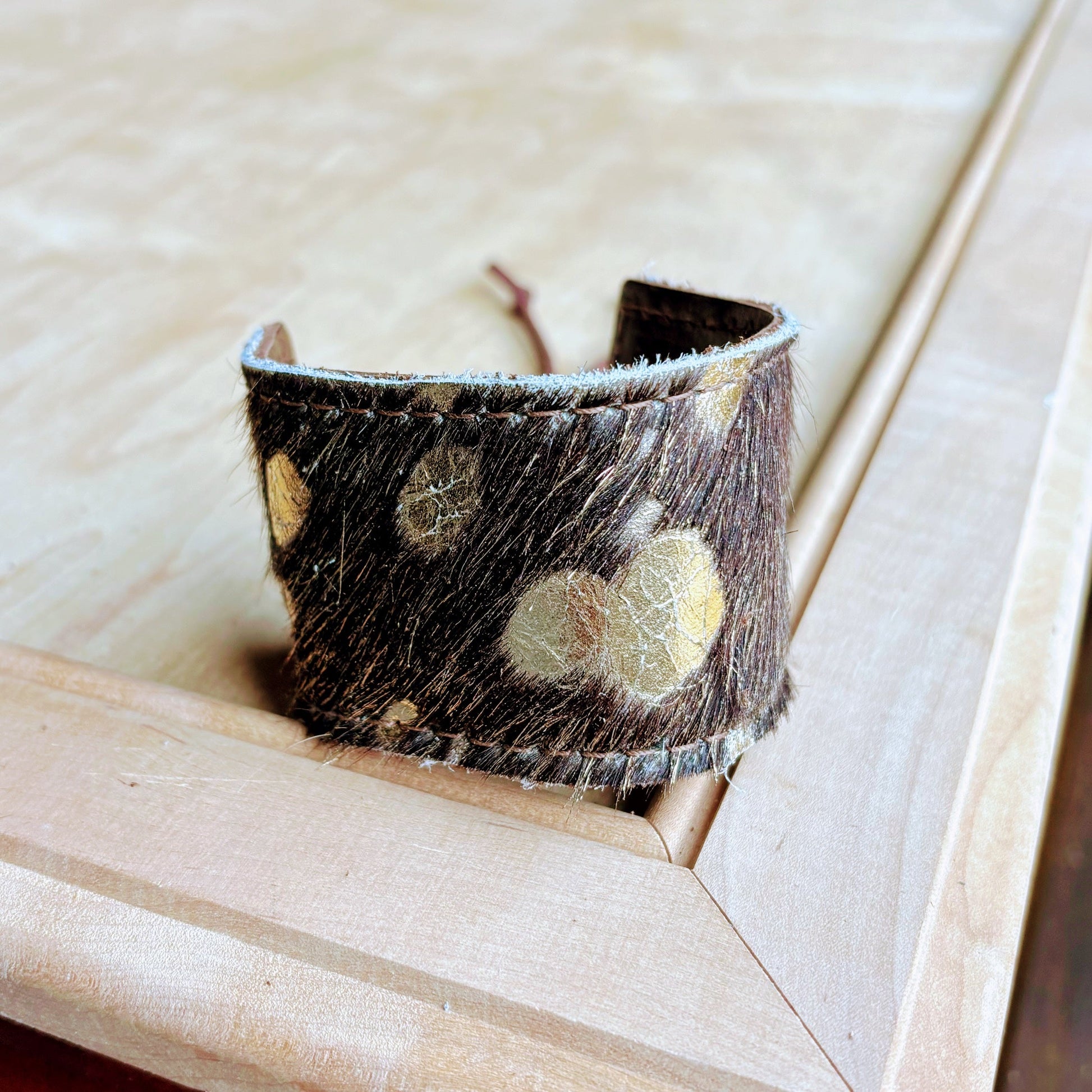 Spice up your boho fashion jewelry collection with this wide leather cuff bracelet! Handmade with genuine, hair-on-hide leather, this unique cuff bracelet is the perfect statement piece to mix in with your other boho accessories. Wear it by itself or stack it with other pieces from our bracelet bar to create your own look. Order now!