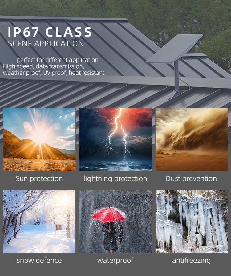 All-Weather Resilience: Designed for reliable performance in various conditions, including intense sun, lightning, dust storms, heavy snow, driving rain (waterproof), and freezing temperatures (antifreezing). It's UV-proof and heat-resistant for consistent outdoor use.