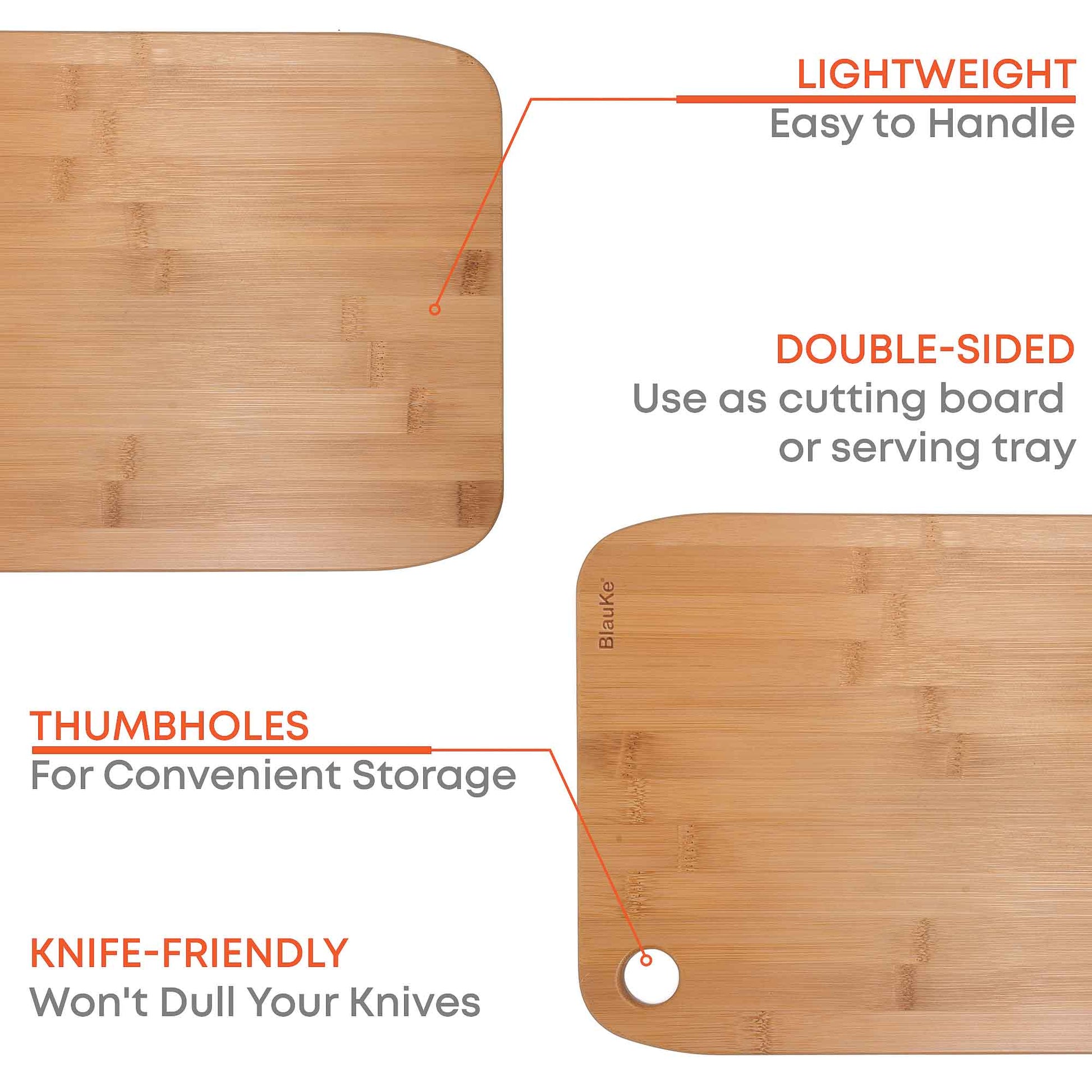 - Our Bamboo Cutting Board Set includes: 1 large cutting board (13 x 9.9 x 0.4 inch); 1 medium bamboo chopping board (11 x 8.7 x 0.4 inch); 1 small cutting board (7.9 x 6 x 0.4 inch).
