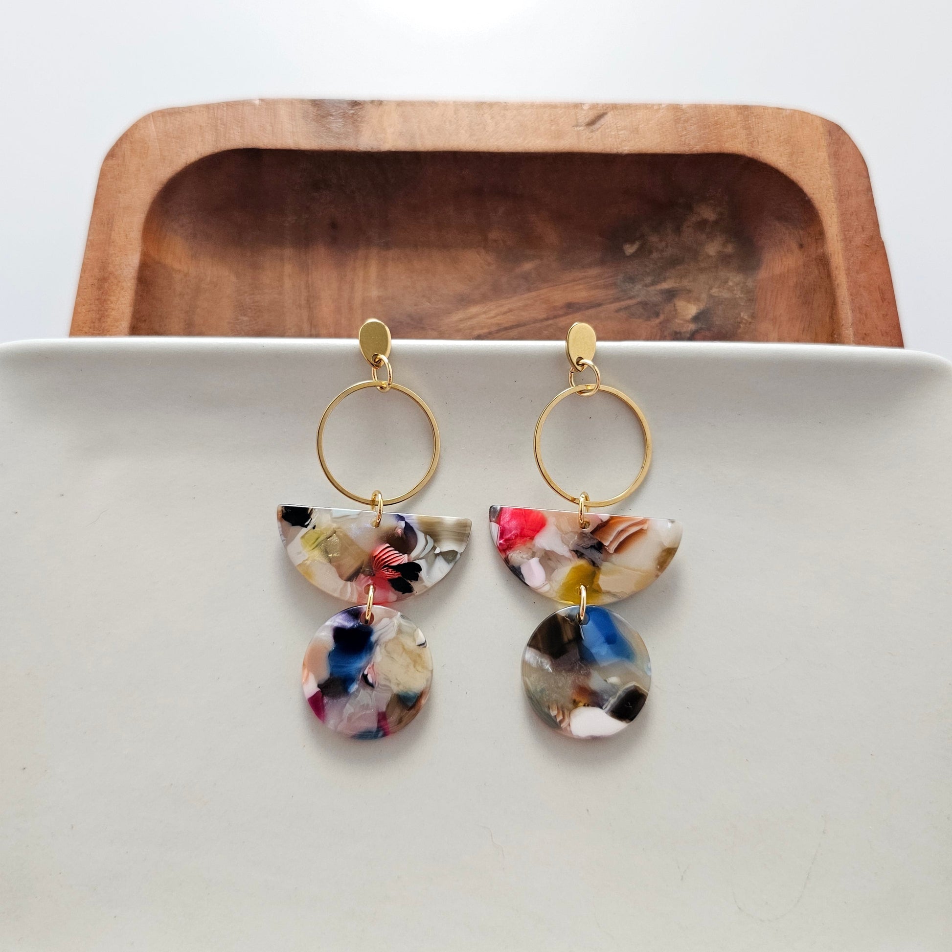 Add a pop of personality with our Wren Earrings! These multicolored dangle earrings feature a unique layered design that will make you stand out in a crowd. Elevate any outfit with these playful and quirky accessories. (Warning: may cause excessive compliments.)