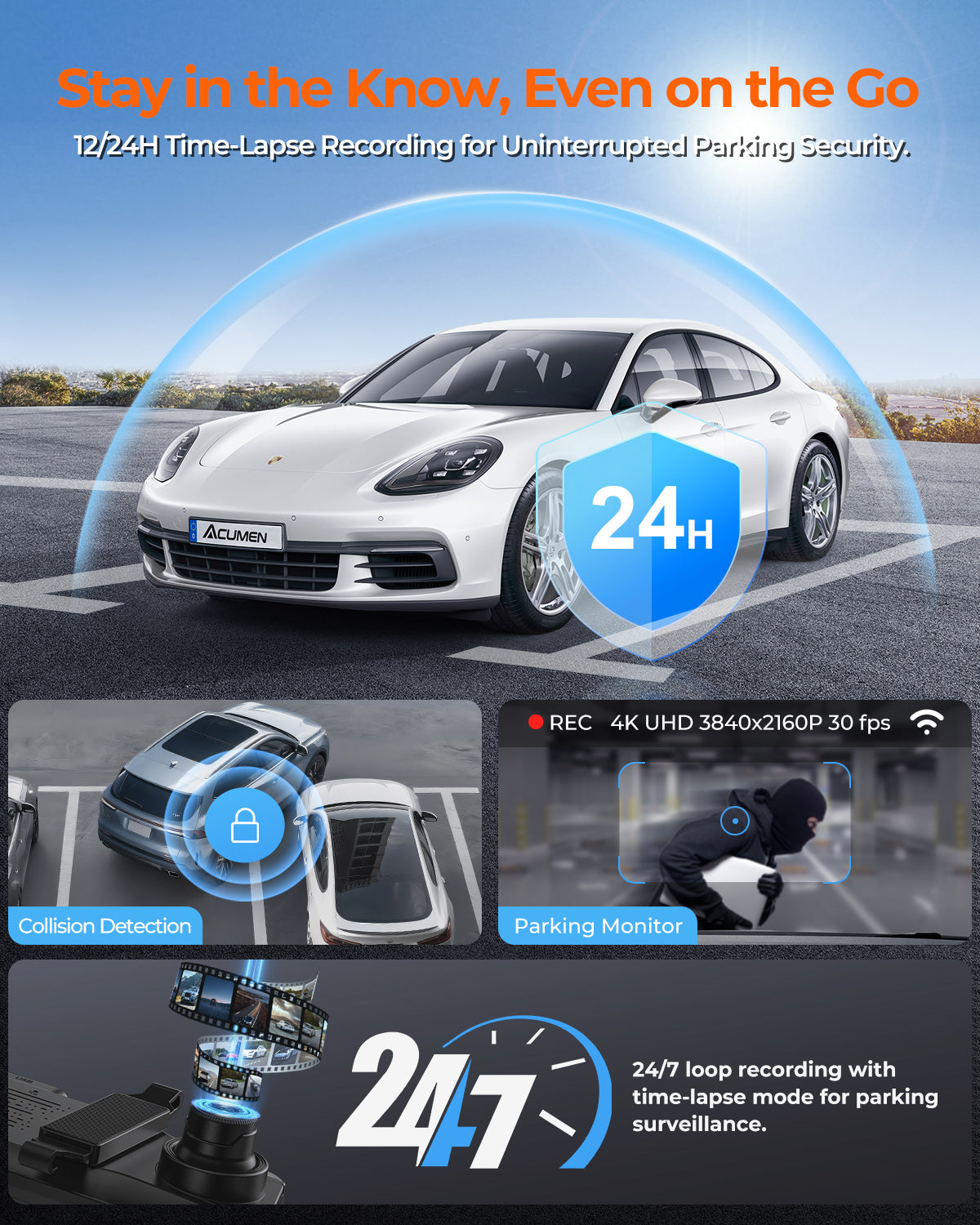 The Acumen XR10 Pro is a state-of-the-art rearview-mirror camera system crafted to provide exceptional visuals and safety for drivers in diverse conditions, from urban roads to light off-road trails. The XR10 Pro features a front camera with a STARVIS-grade CMOS sensor, a high-performance ISP processor, and a 6-layer full-glass wide-angle lens, delivering stunning 4K video (3840×2160 P @ 30 fps) for crystal-clear license plates and road signs. Its 2.5 K rear camera, equipped with Ultra HD WDR and a 170° wide-angle lens, offers a 1.5× larger view than traditional mirrors, reducing blind spots with glare-free night vision.